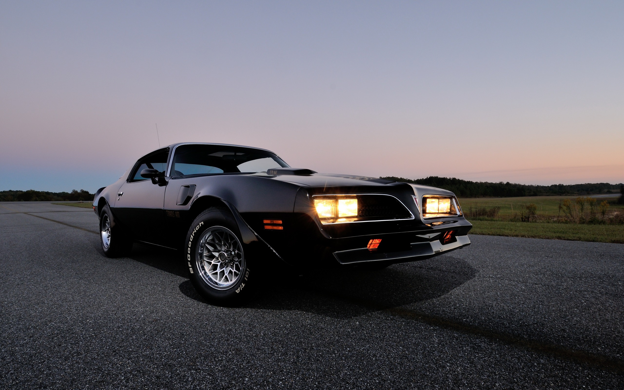 Description: A black car parked on the side of the road at dusk with the headlights on and the hood up.