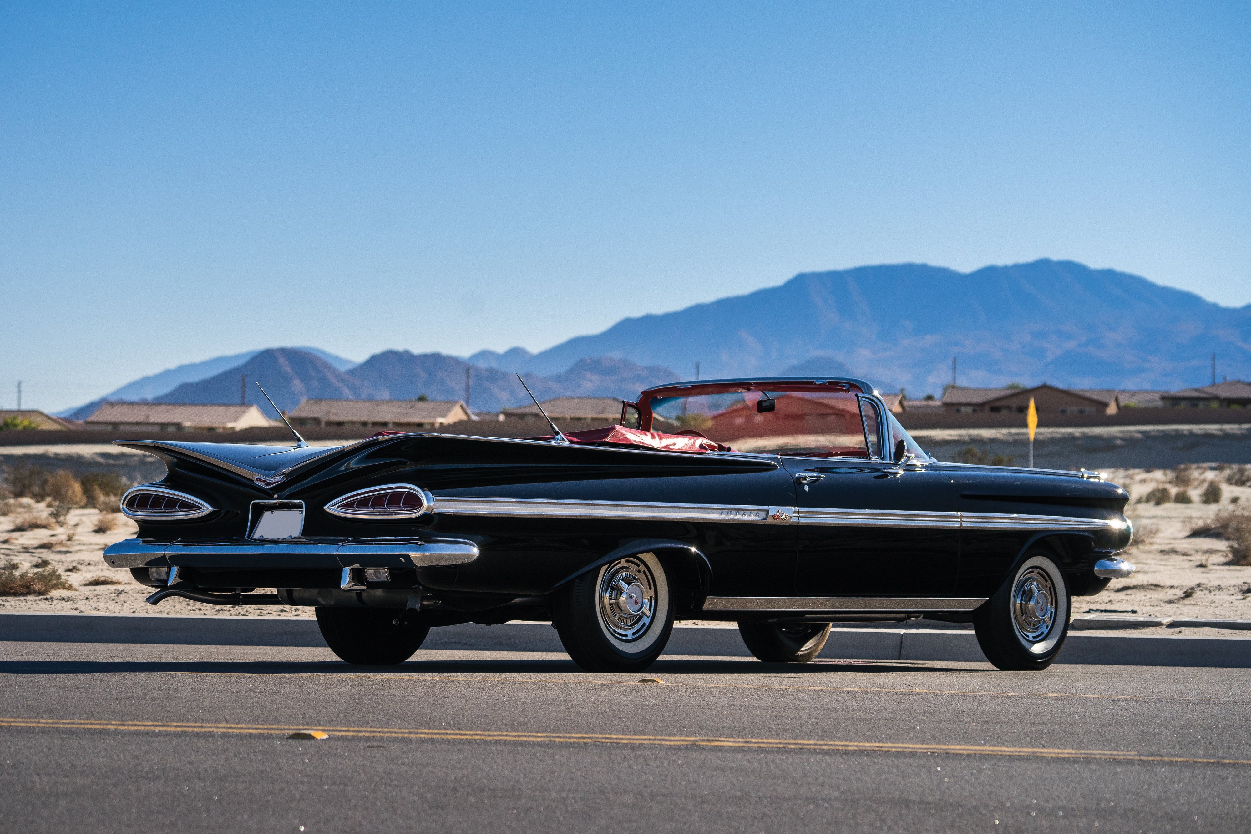 Description: A black car parked on the side of the road with mountains in the background and a sky background with no clouds.