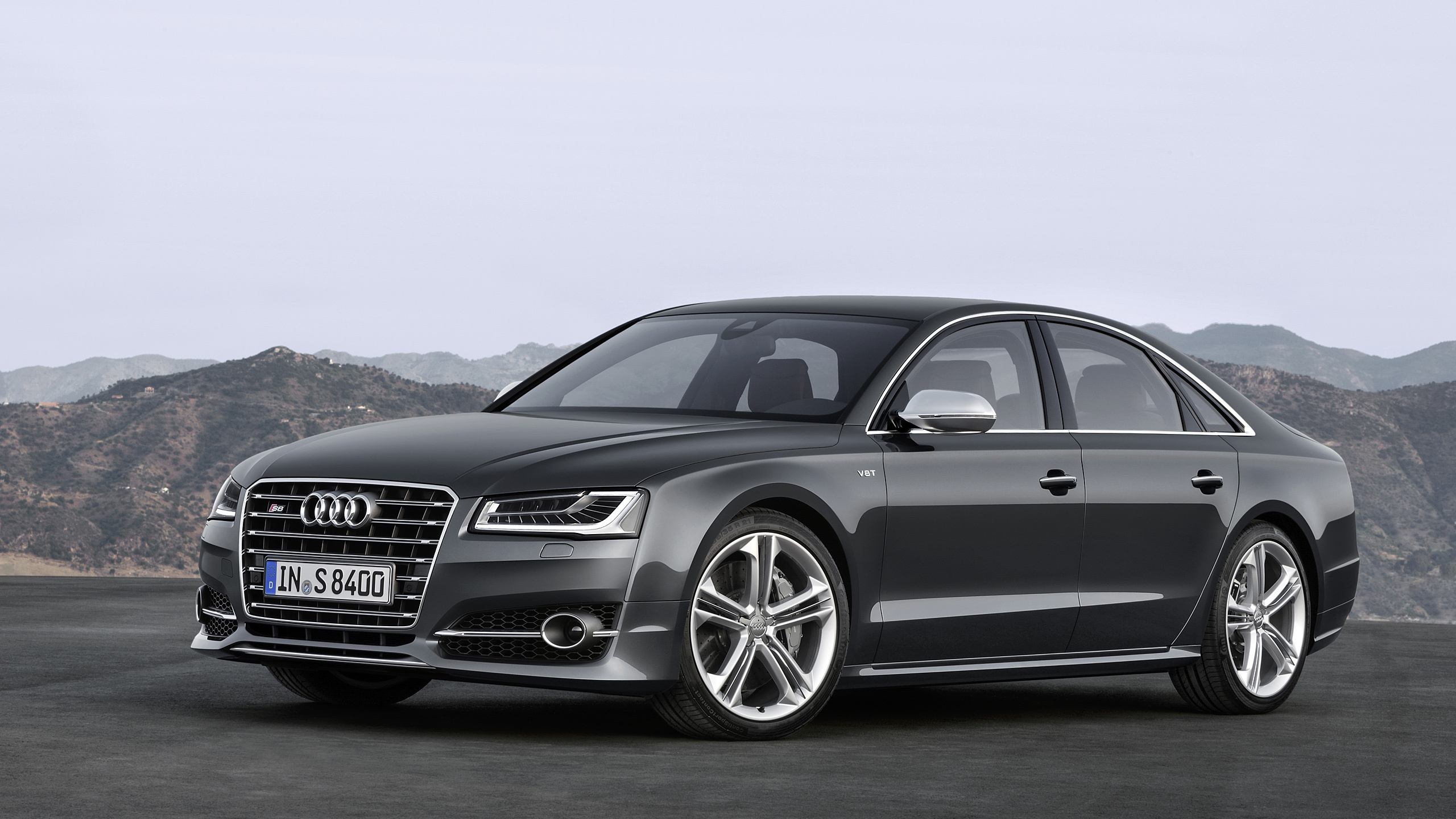 Description: A black car parked in front of a mountain range with mountains in the background and a sky background with clouds.