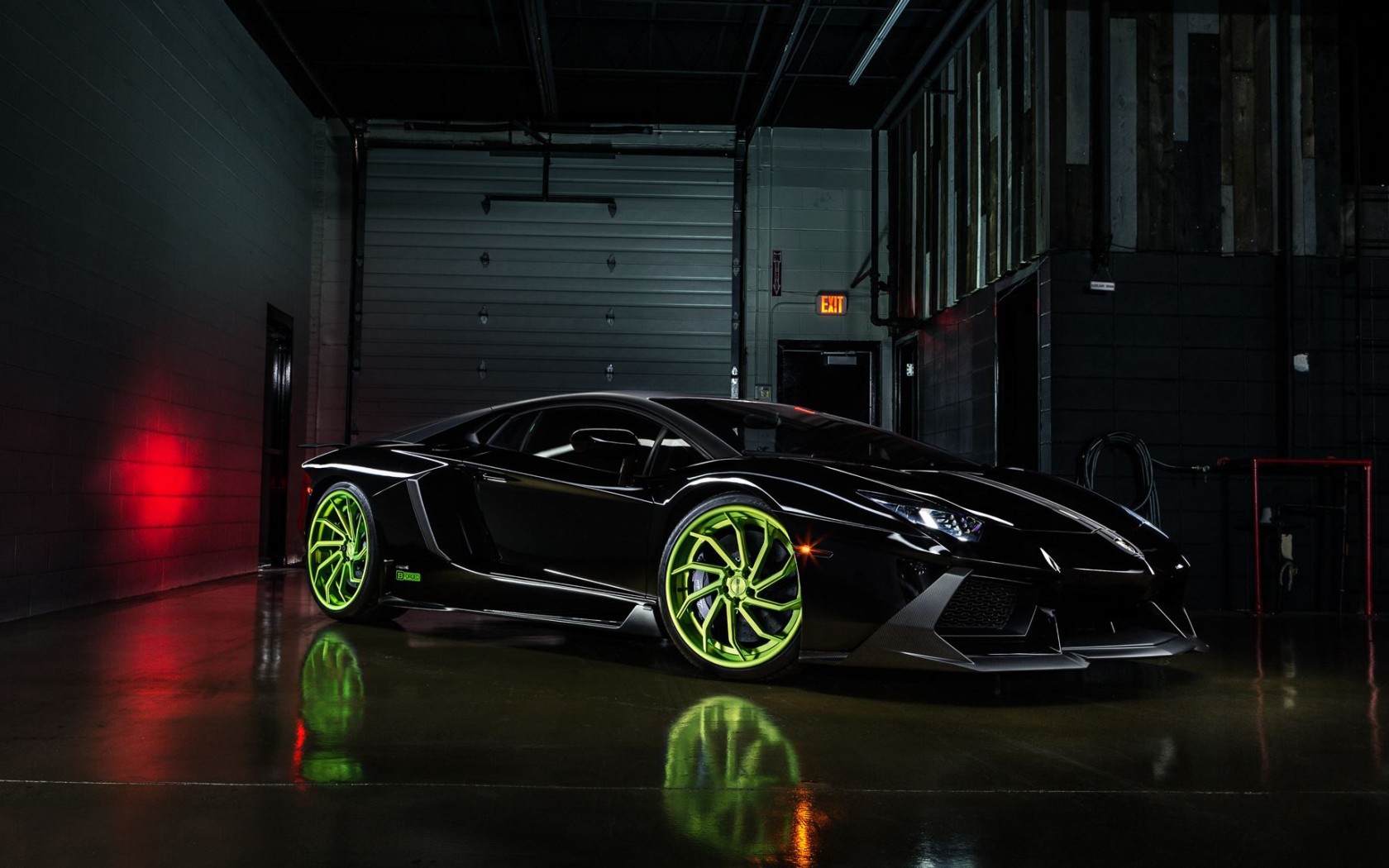 Description: A black car with neon green wheels in a garage with a red light on the side of it and a red light on the side of the car.