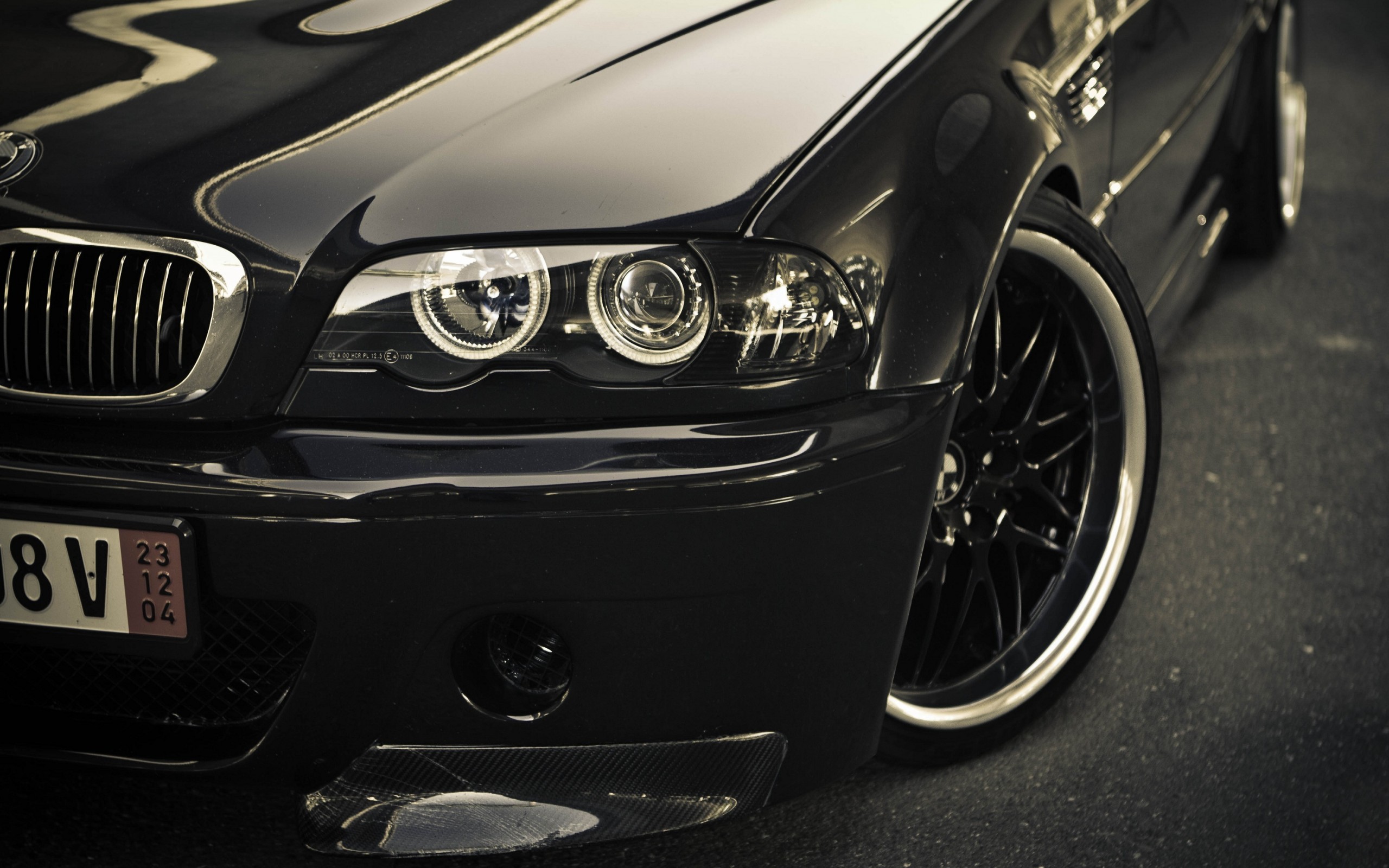 Description: A black car with a number plate on it's front bumper and a number plate on the front bumper.