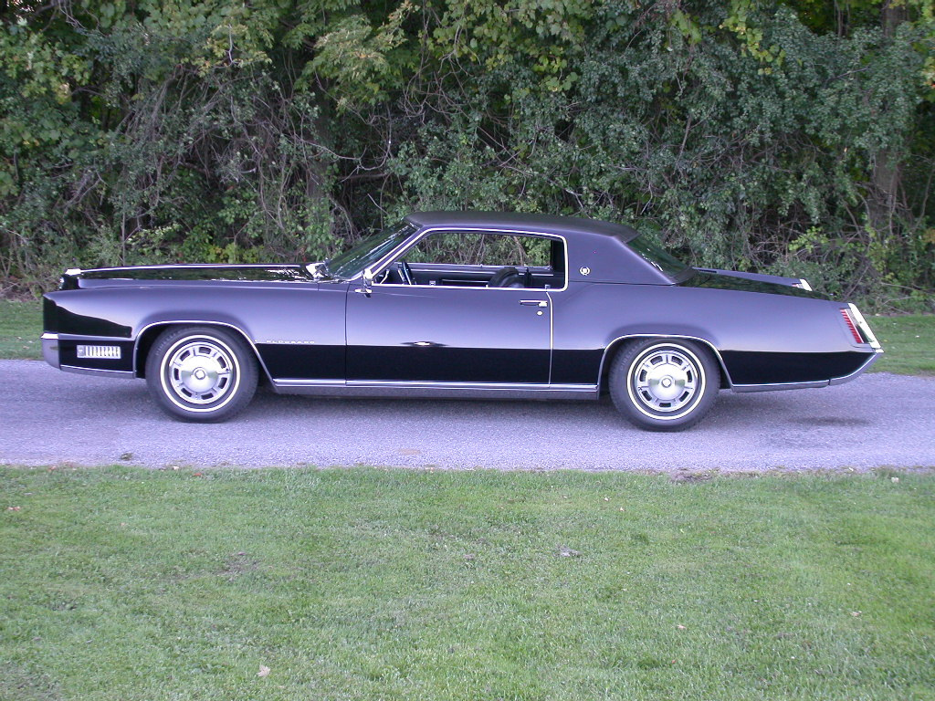 Description: A black car parked on a road next to a forest of trees and grass in a park area with a paved road.