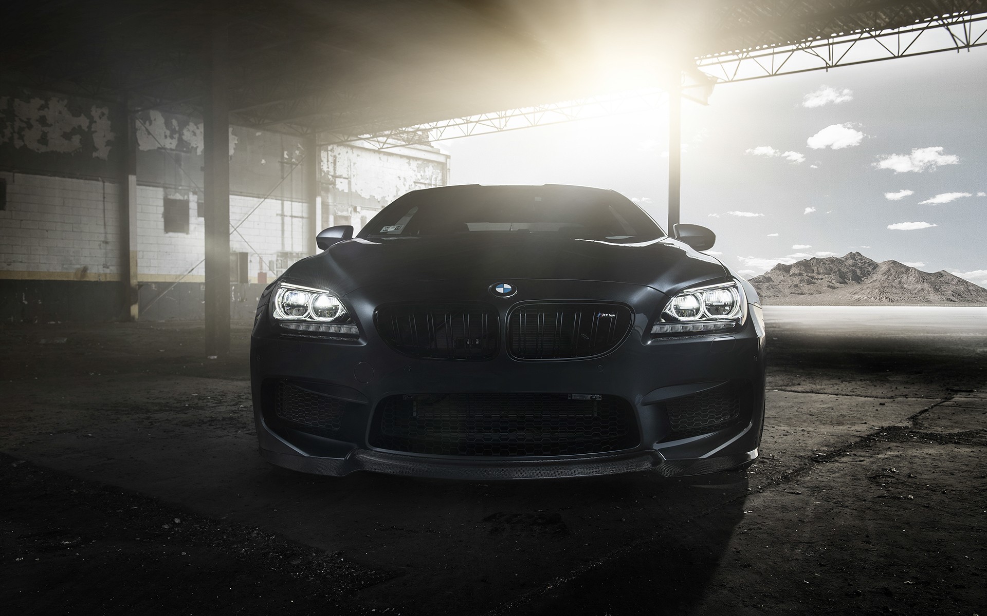 Description: A black car parked in a parking garage with the sun shining through the clouds behind it and a mountain range in the background.