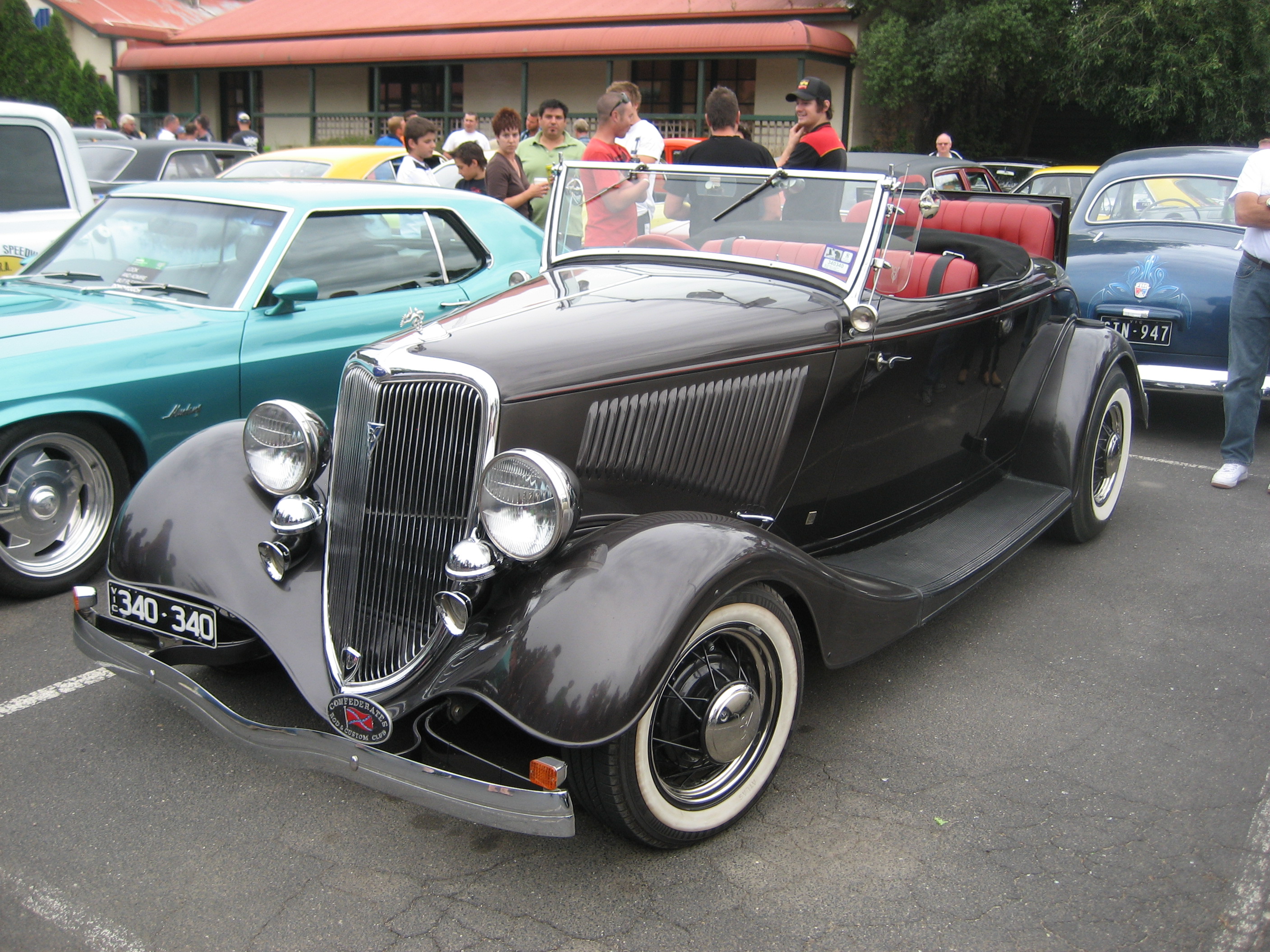 Description: A black car parked in a parking lot next to other cars and people standing around it and a building.
