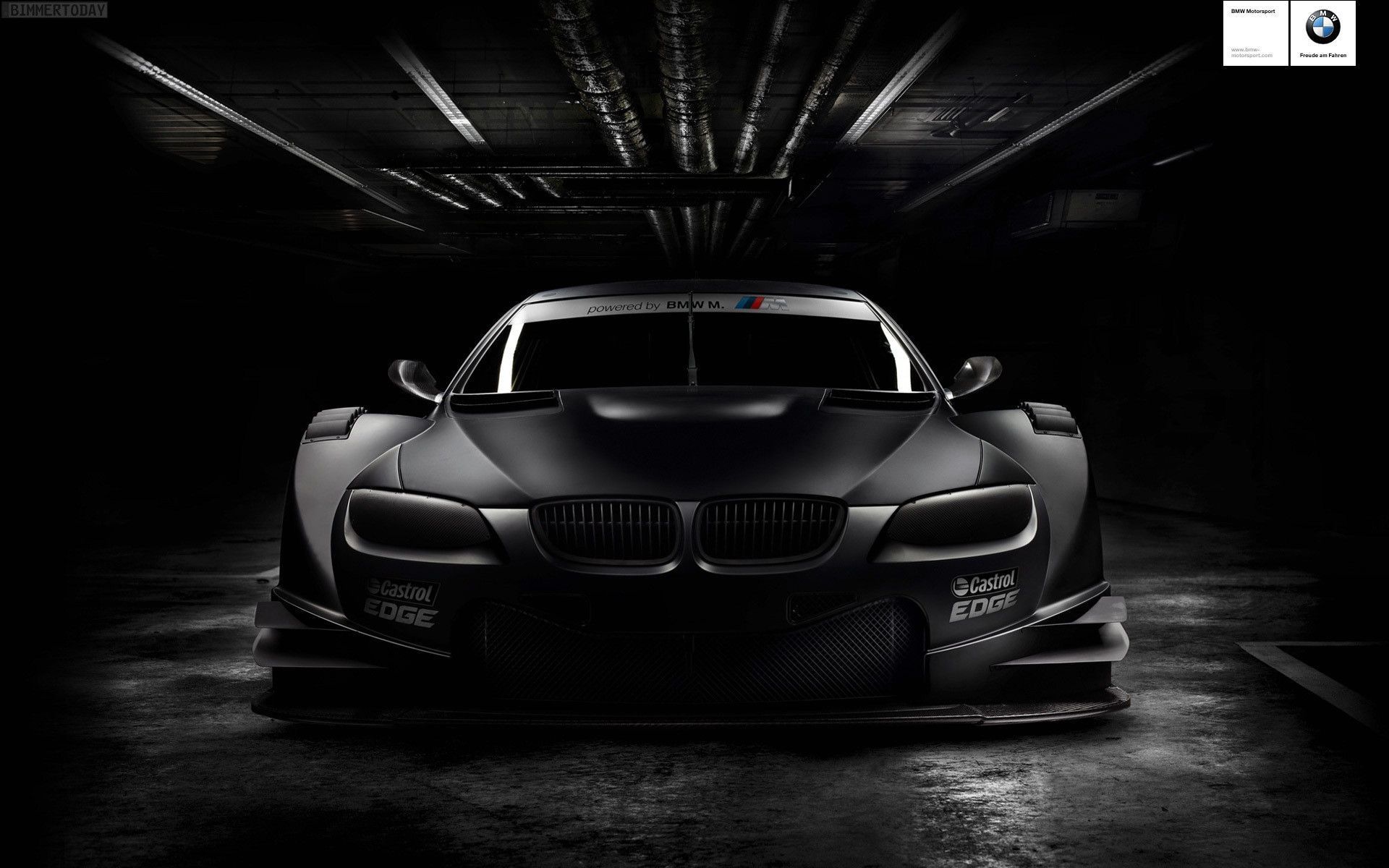 Description: A black car parked in a dark garage with a red light on it's headlight and a black background.
