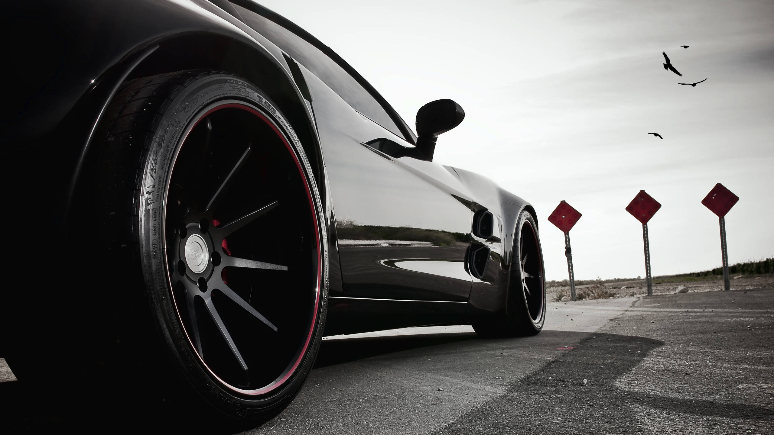 Description: A black car parked on the side of a road with red and white street signs in the background and a bird flying overhead.