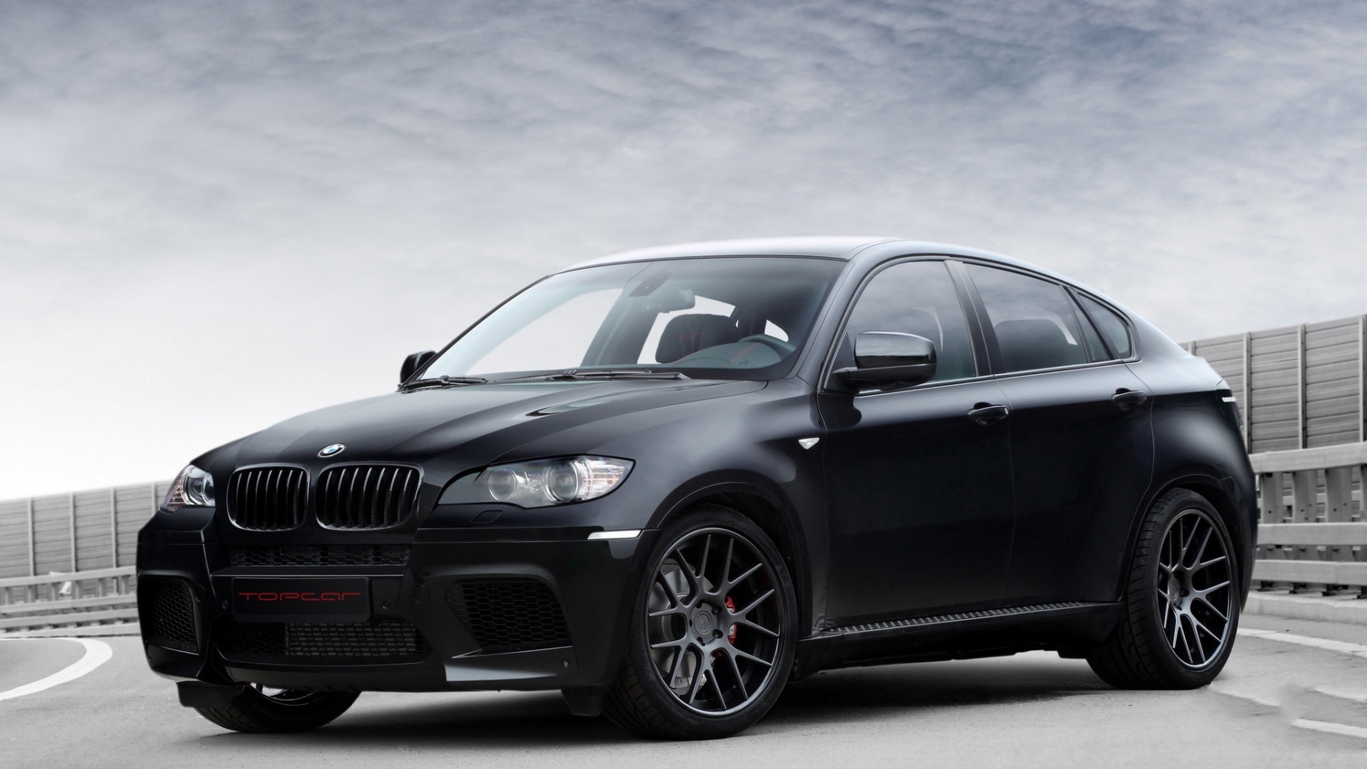 Description: A black car is driving down a road with a sky background and clouds in the background.