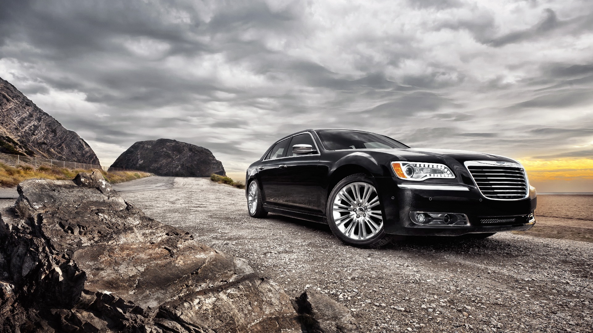 Description: A black car parked on a rocky road near a mountain range at sunset with a dramatic sky in the background.