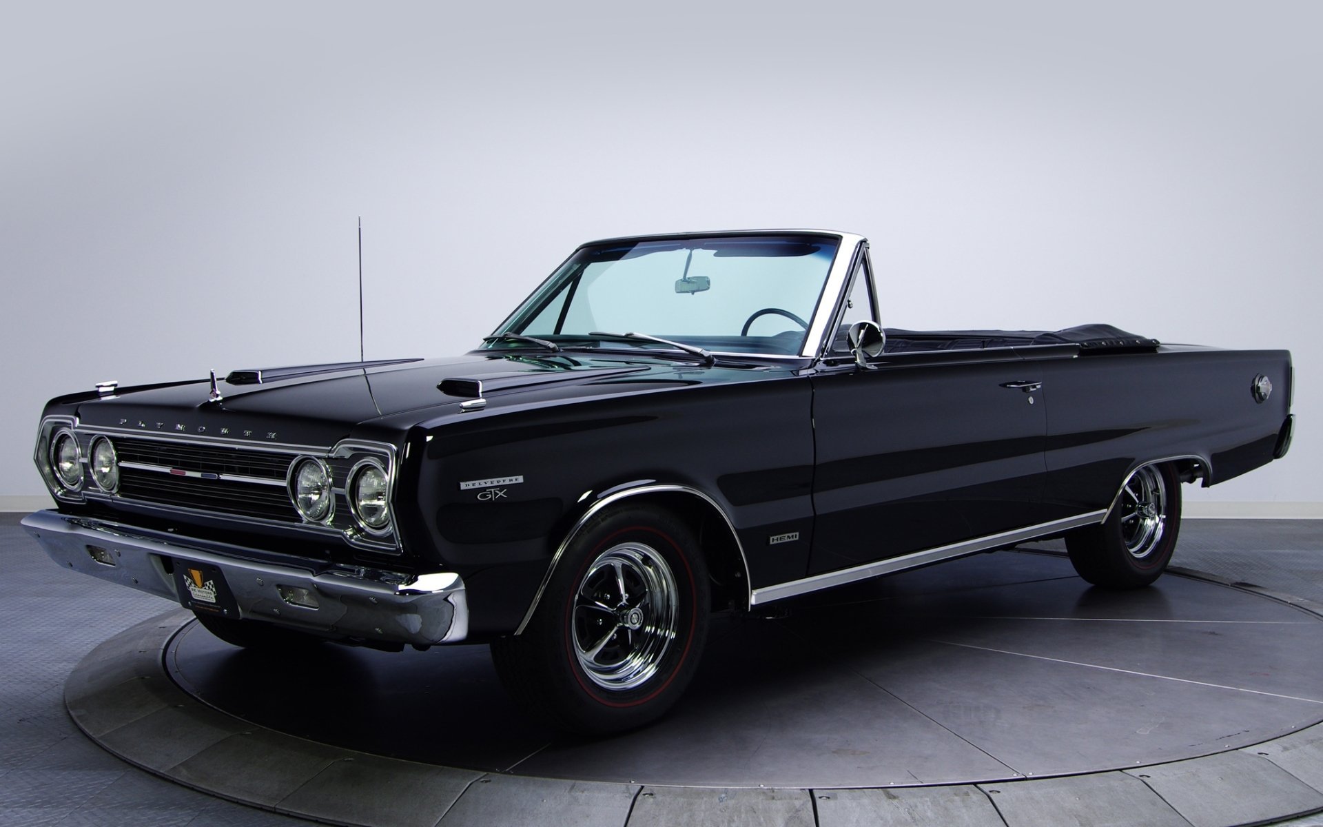 Description: A black car is on display in a room with a round floor and a white wall behind it and a black floor.