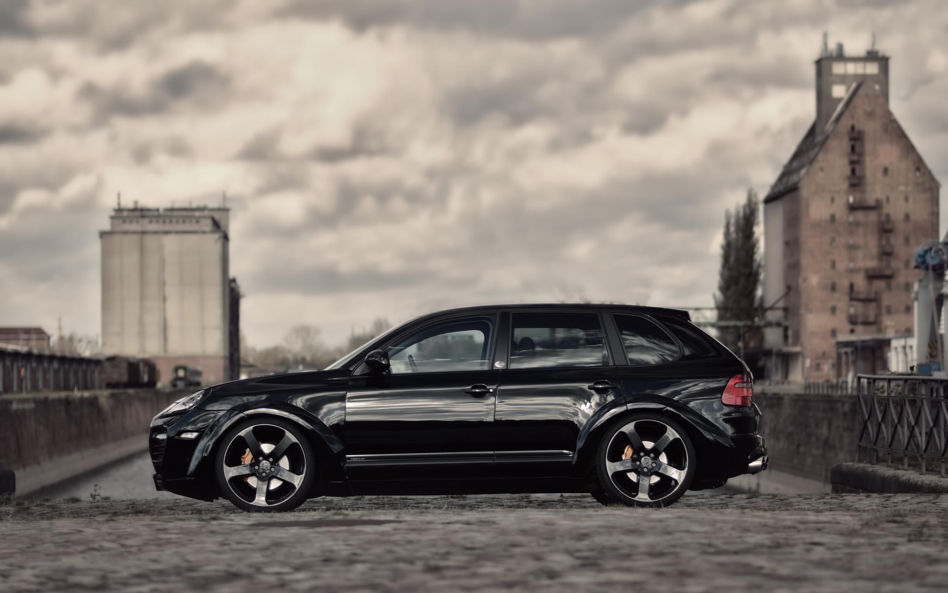 Description: A black car parked on a street next to a building and a bridge with a cloudy sky in the background.