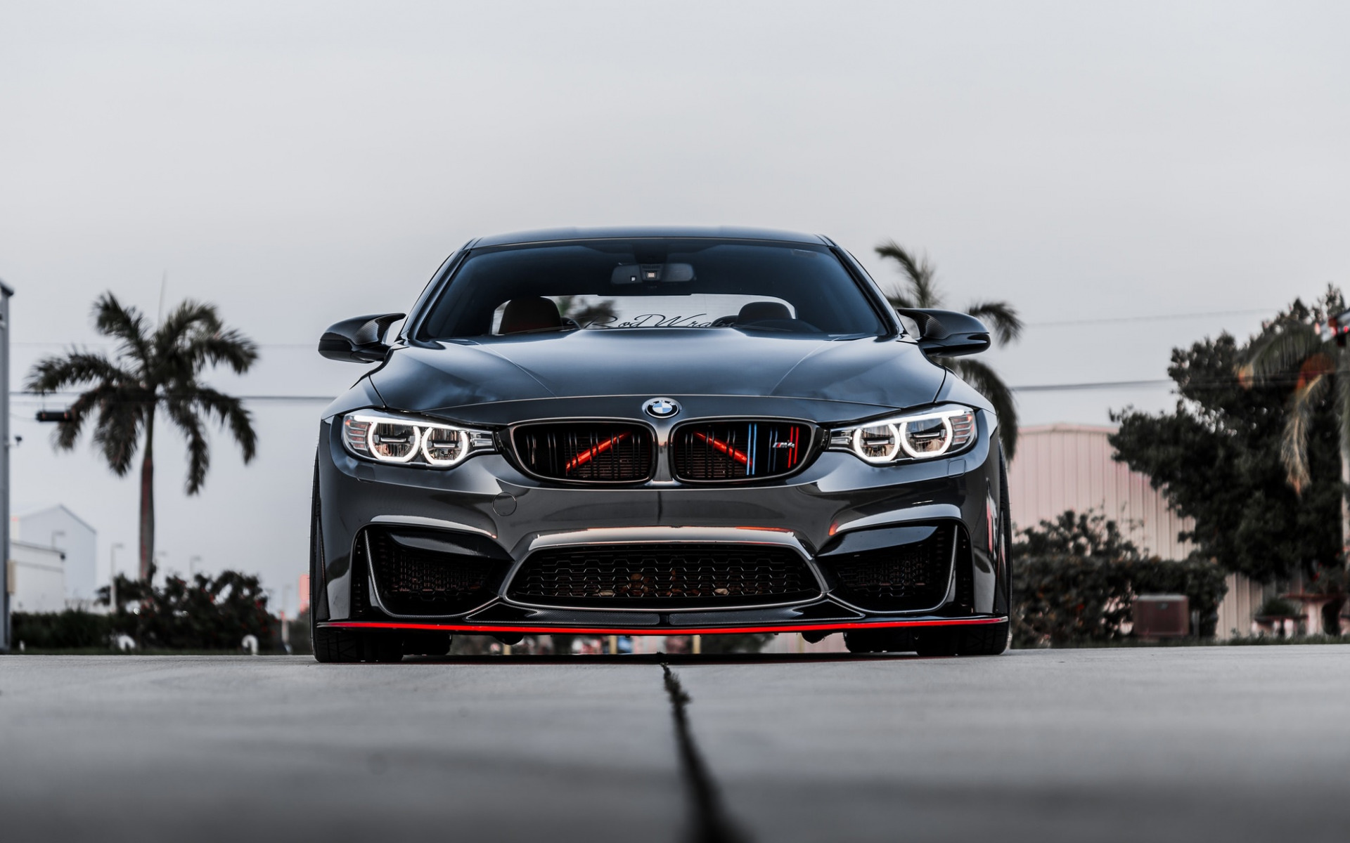 Description: A black car parked on a street next to palm trees and buildings in the background with a red light on the front.