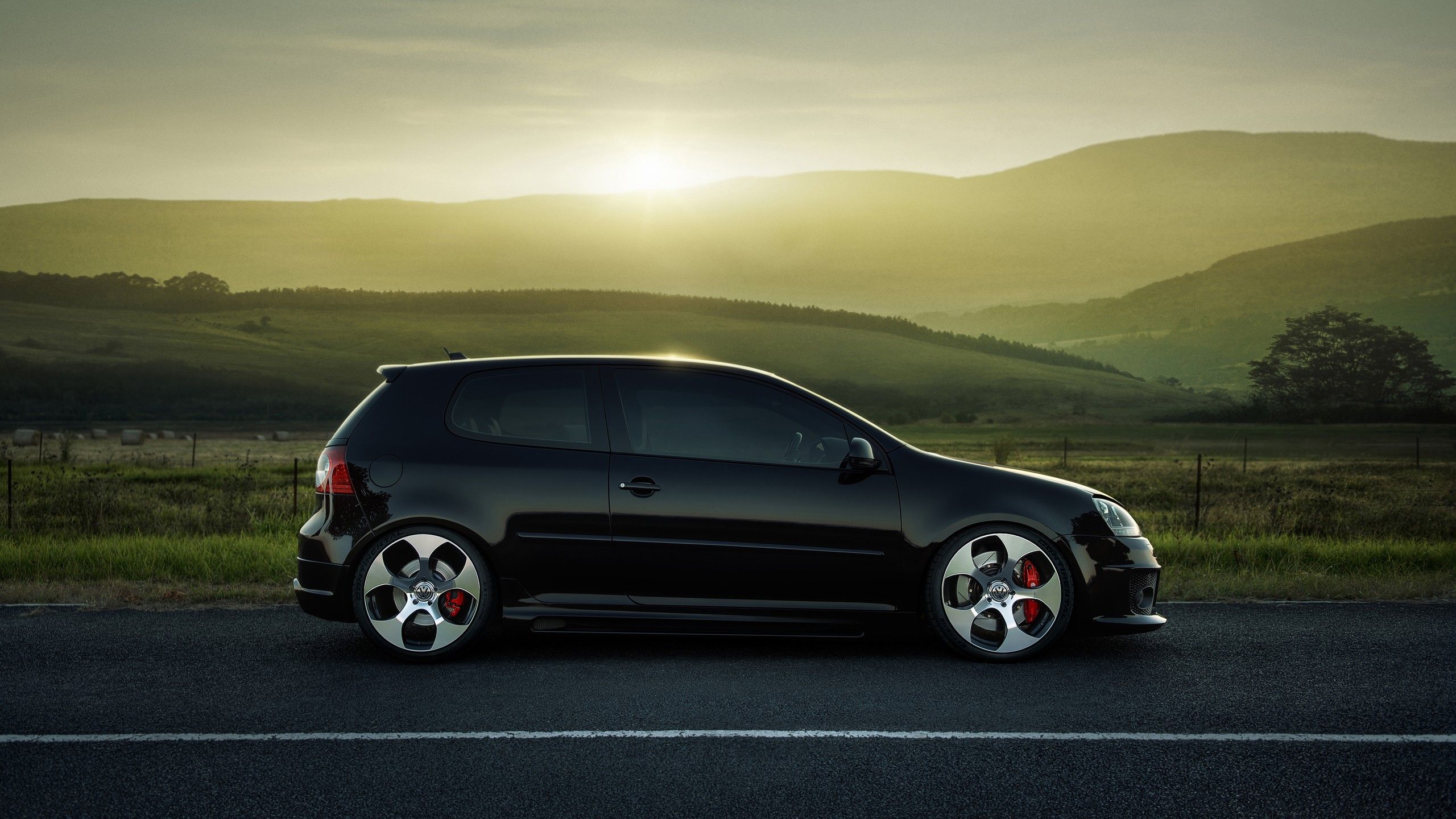 Description: A black car parked on the side of a road near a field and mountains at sunset with the sun shining.