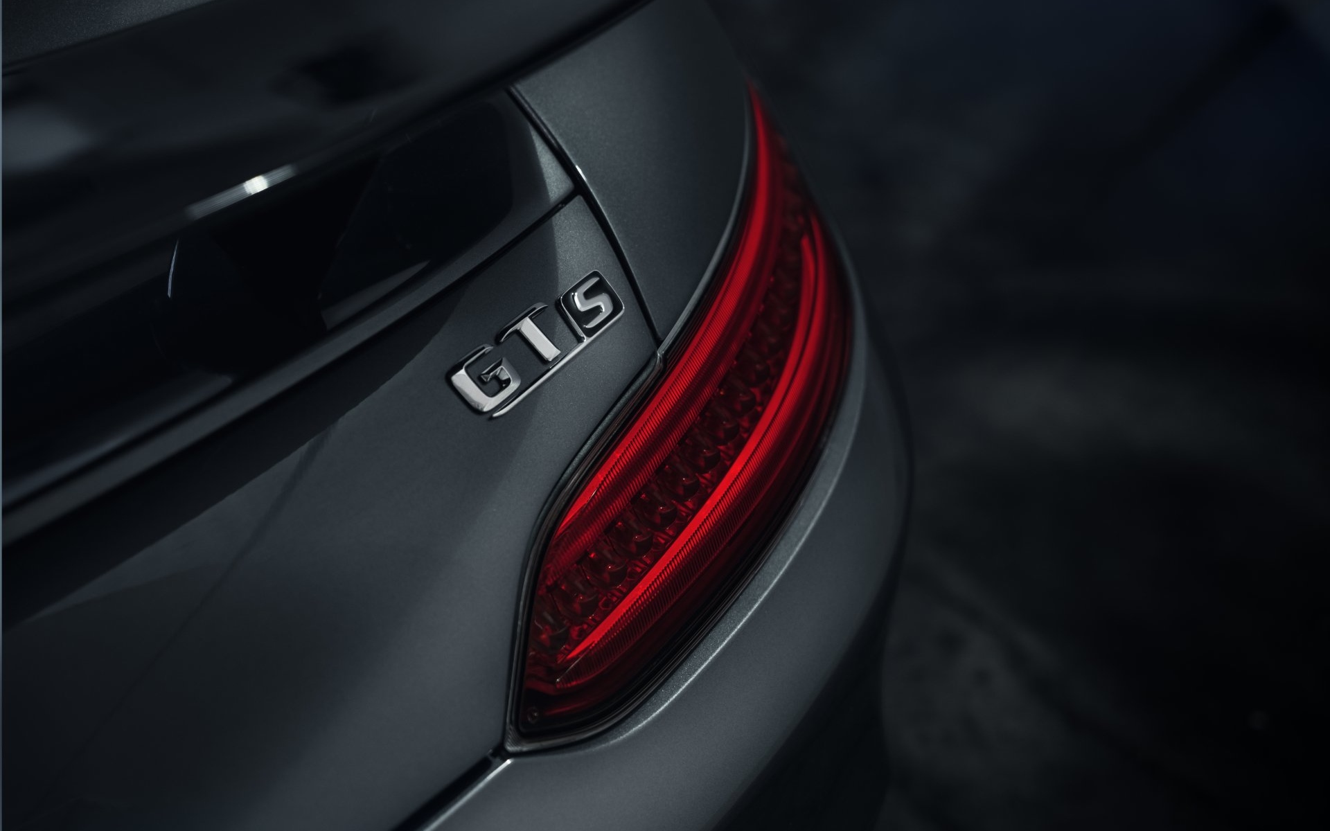 Description: The tail light of a black car with a red brake light on it's taillight is shown.