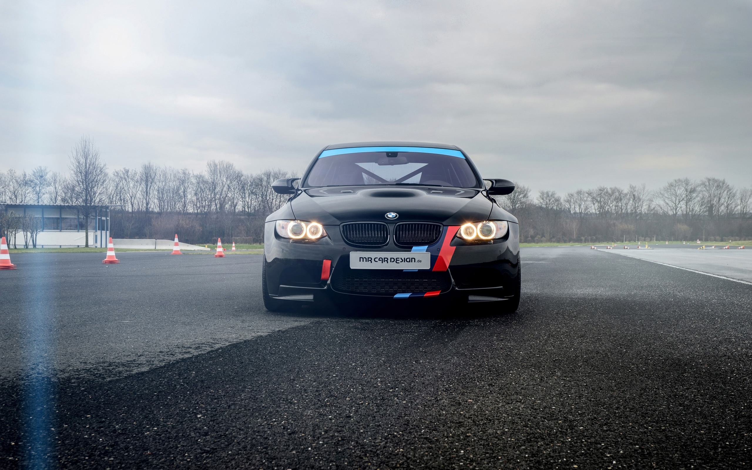 Description: A black car parked on a road with a sky background and trees in the background with orange cones around it.