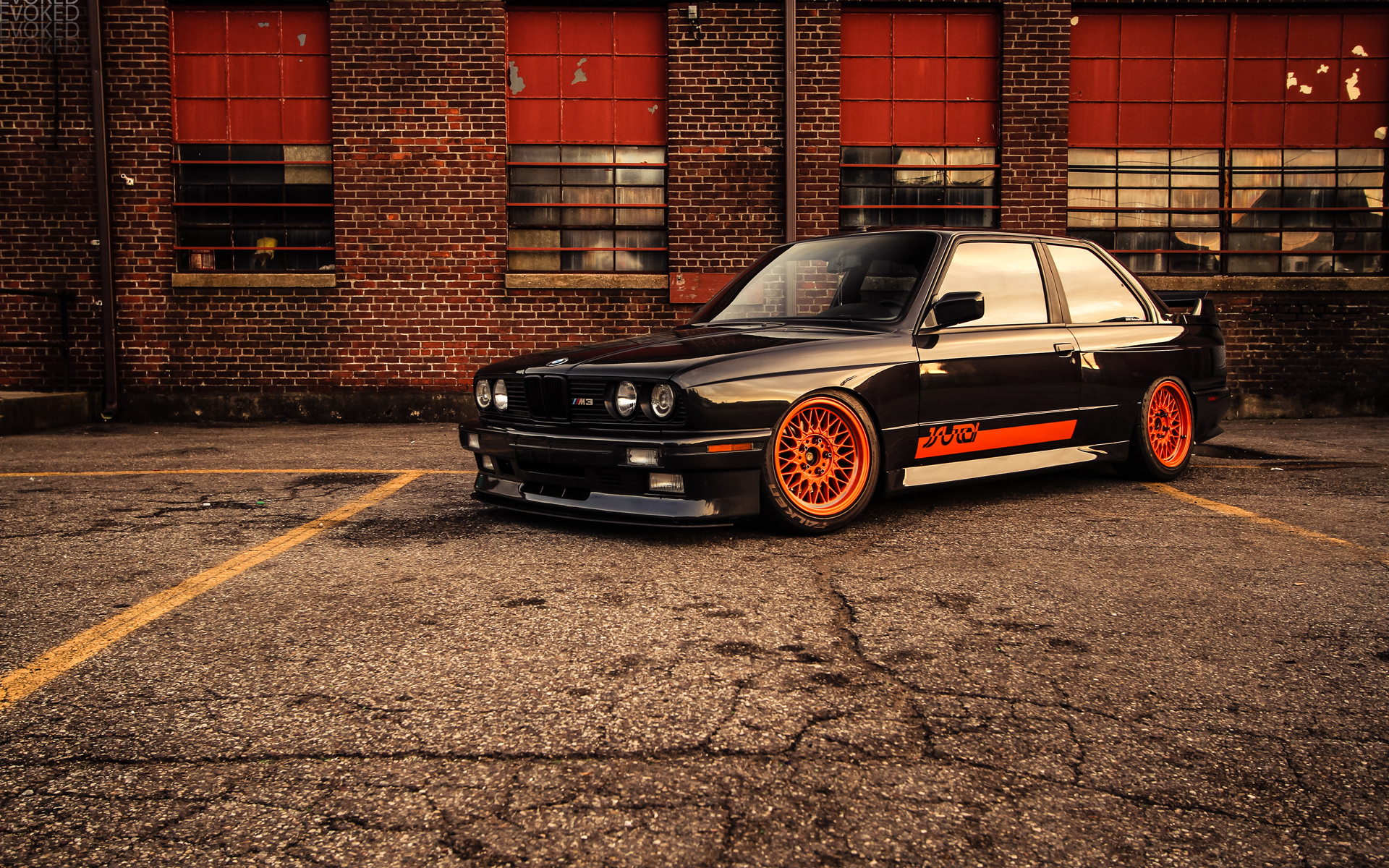 Description: A black car parked in a parking lot next to a building with red windows and a yellow stripe on the side.