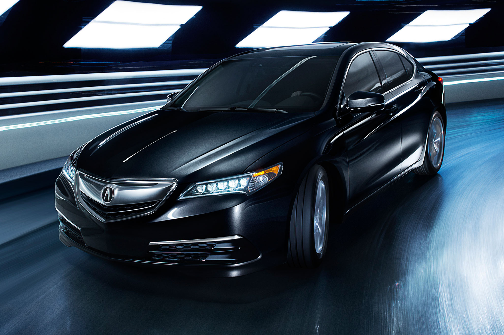 Description: A black car driving down a tunnel with bright lights on it's sides and a black hood and headlights.