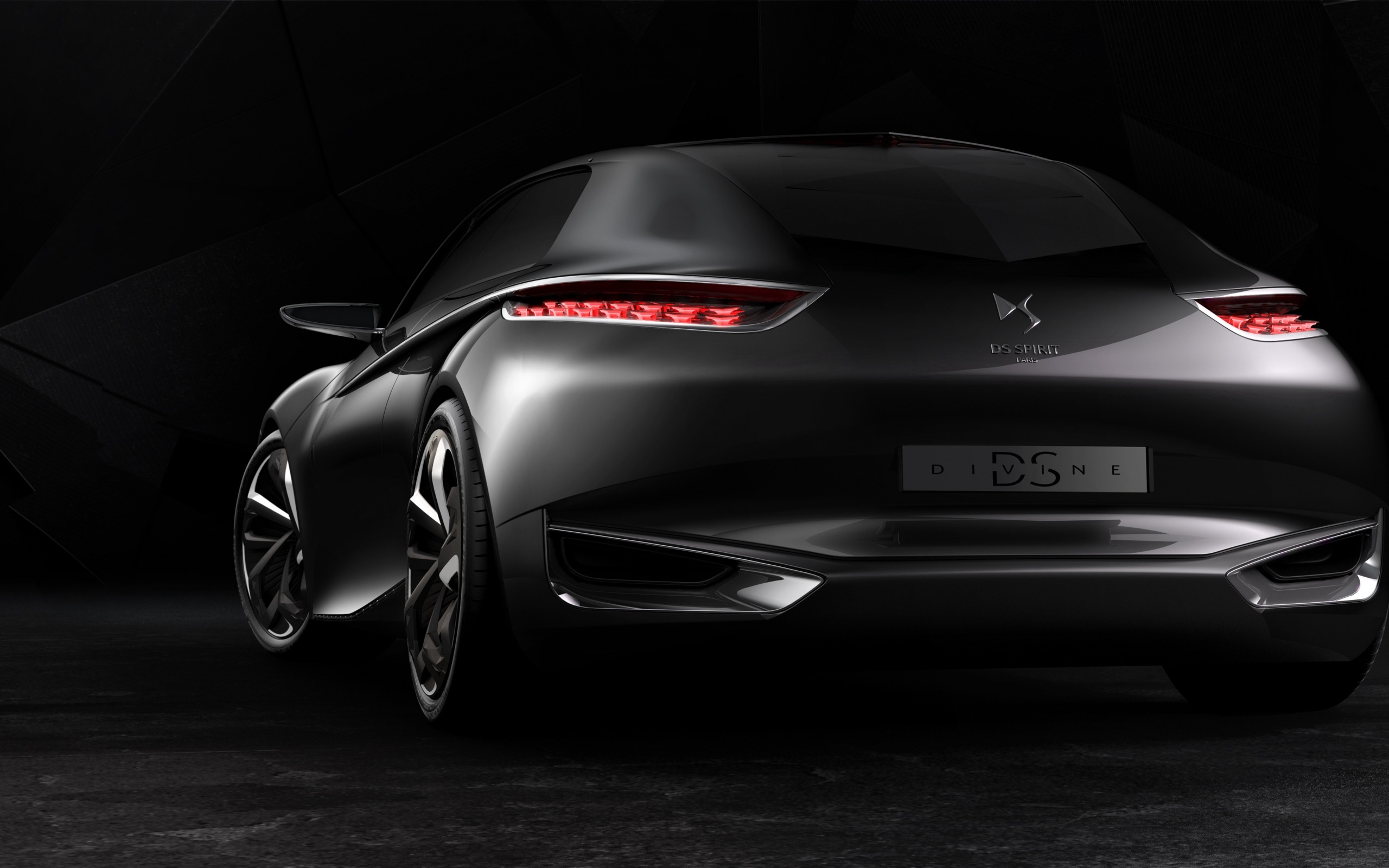 Description: A black car with a white license plate on it's tail lights and a black background with a black triangle.
