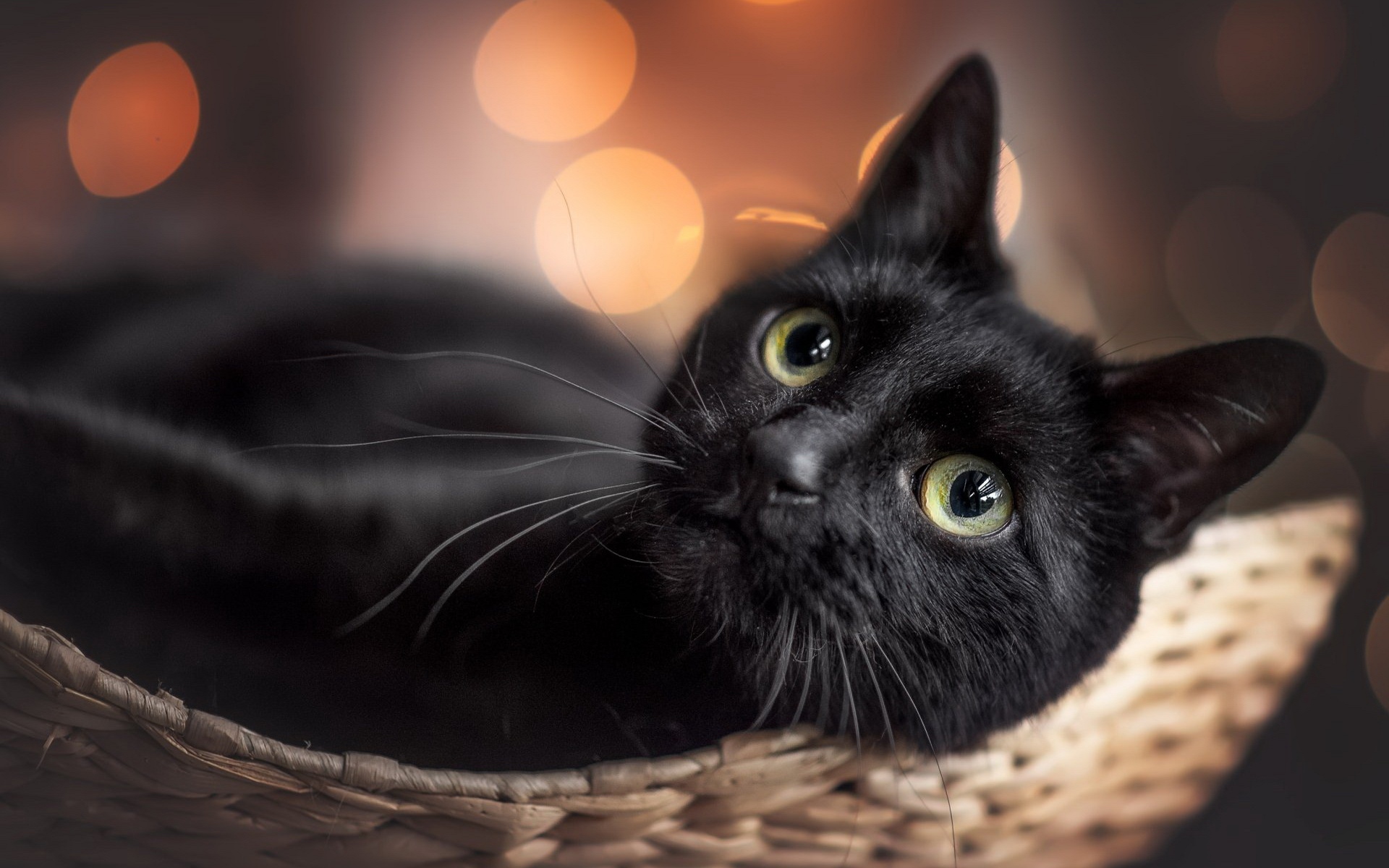 Description: A black cat laying in a basket with a blurry background of lights in the background and a boke of lights.