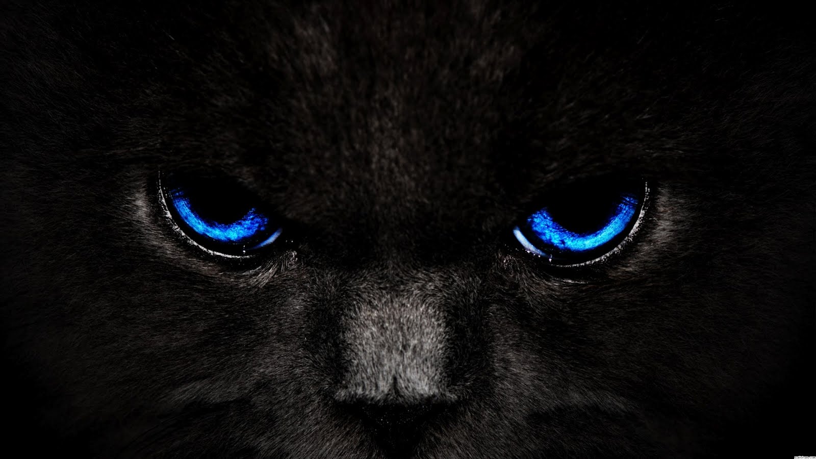 Description: A black cat with blue eyes looking at the camera with a black background and a black background with a blue cat's eyes.
