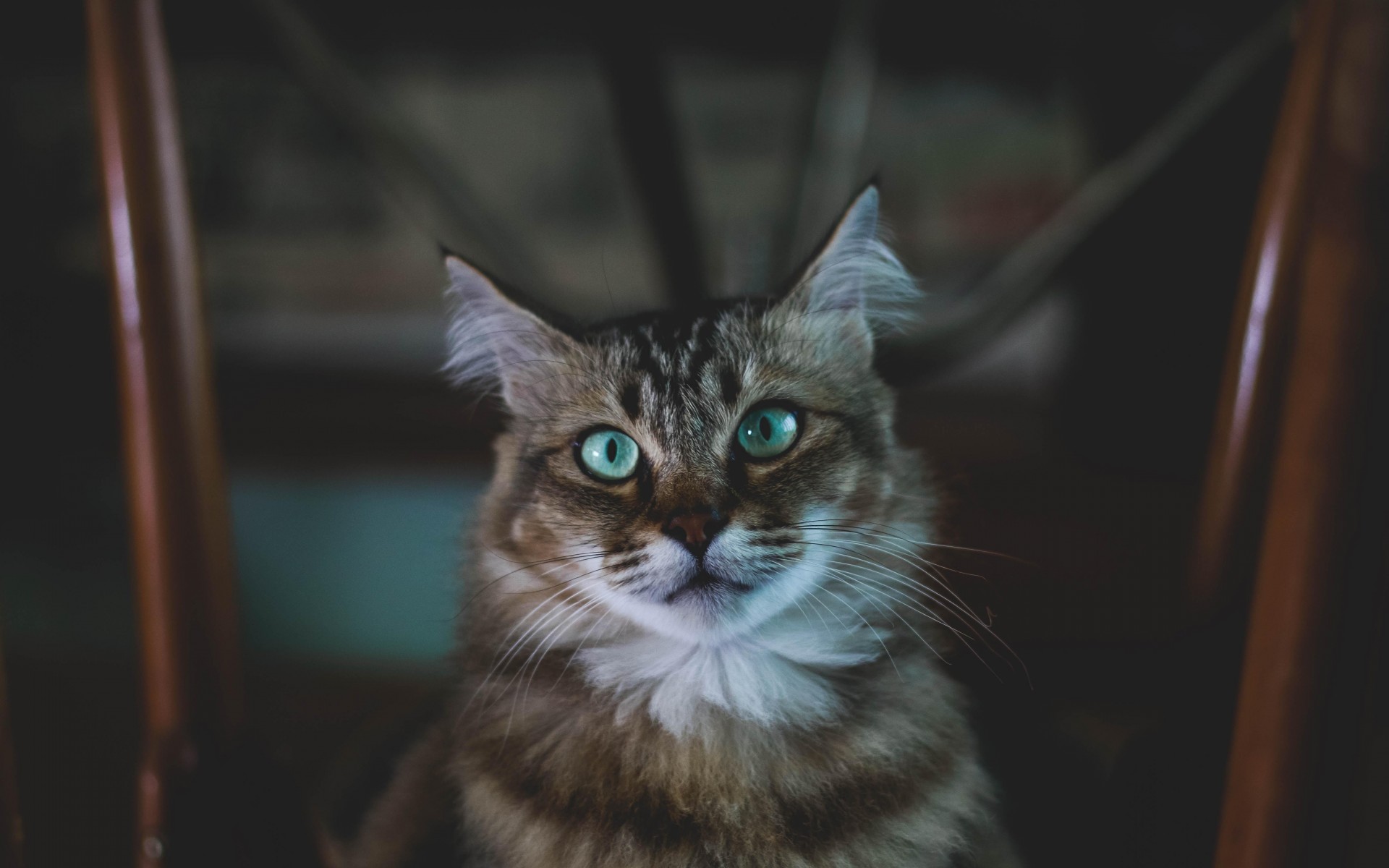 Description: A cat with blue eyes sitting on a chair looking at the camera with a sad look on its face.