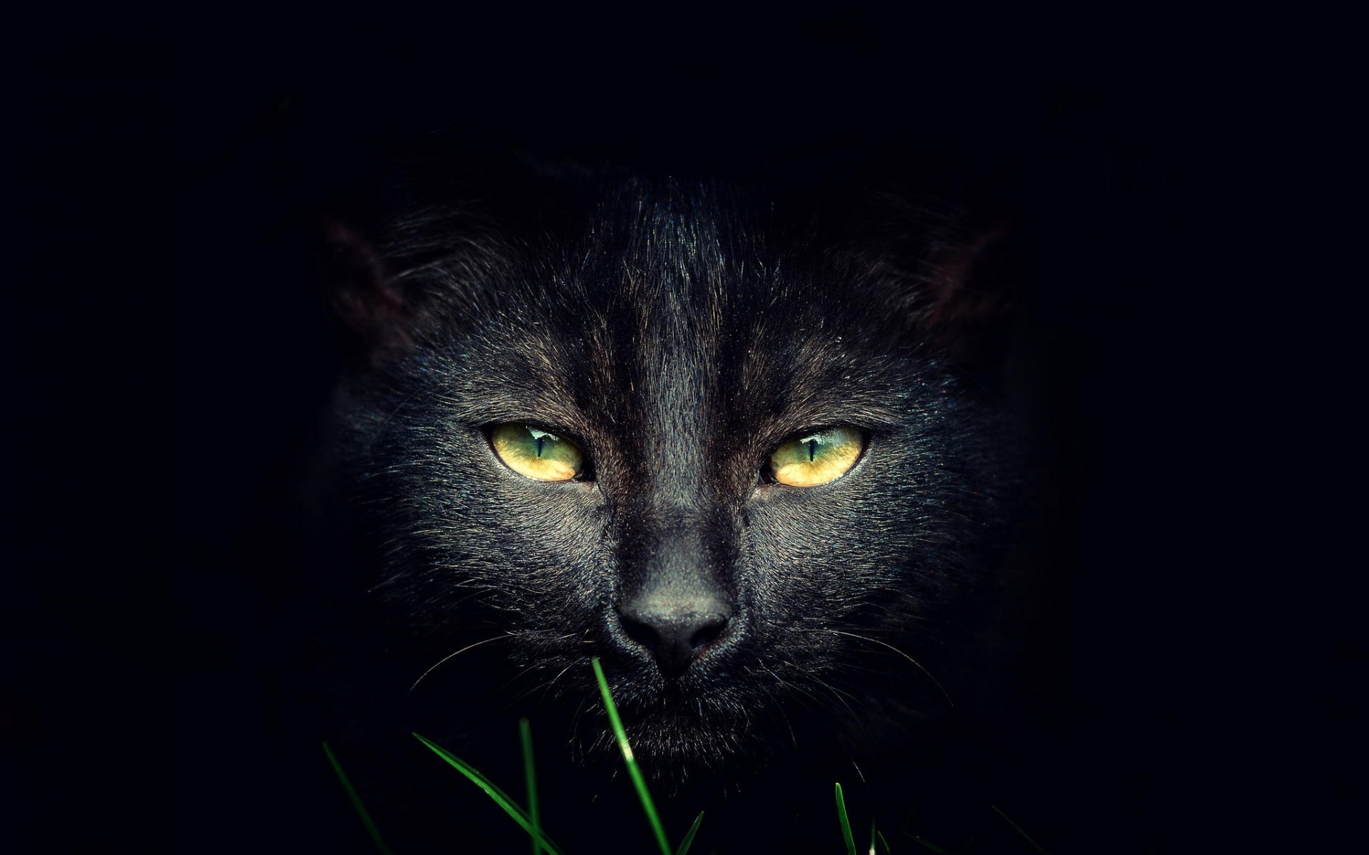 Description: A black cat with yellow eyes is staring at the camera with grass in front of it and a black background.