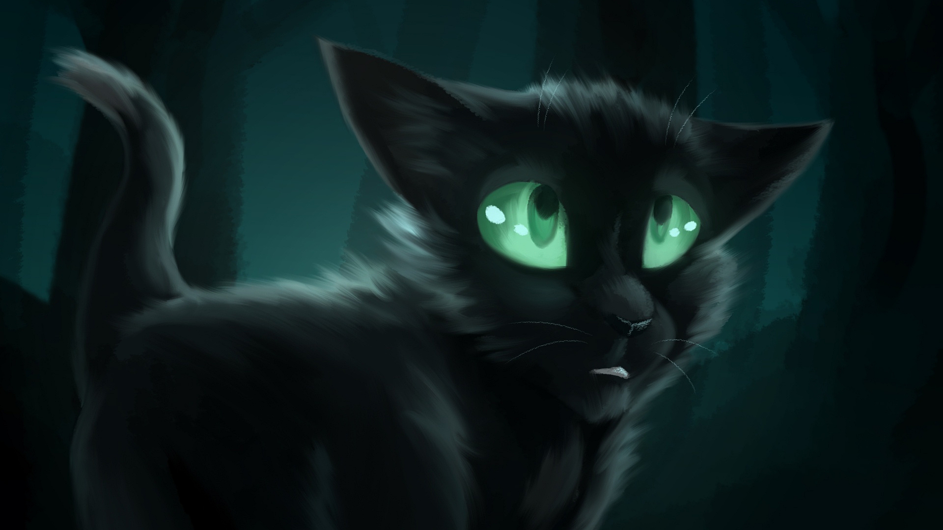 Description: A black cat with glowing green eyes in the dark forest at night time.