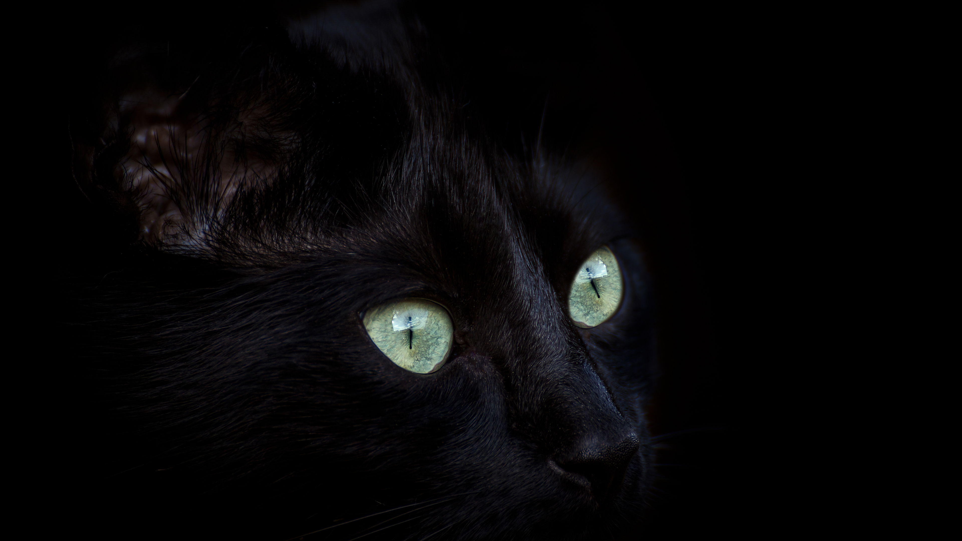 Description: A black cat with glowing green eyes looking at the camera with a dark background and a black background with a black cat with glowing green eyes.