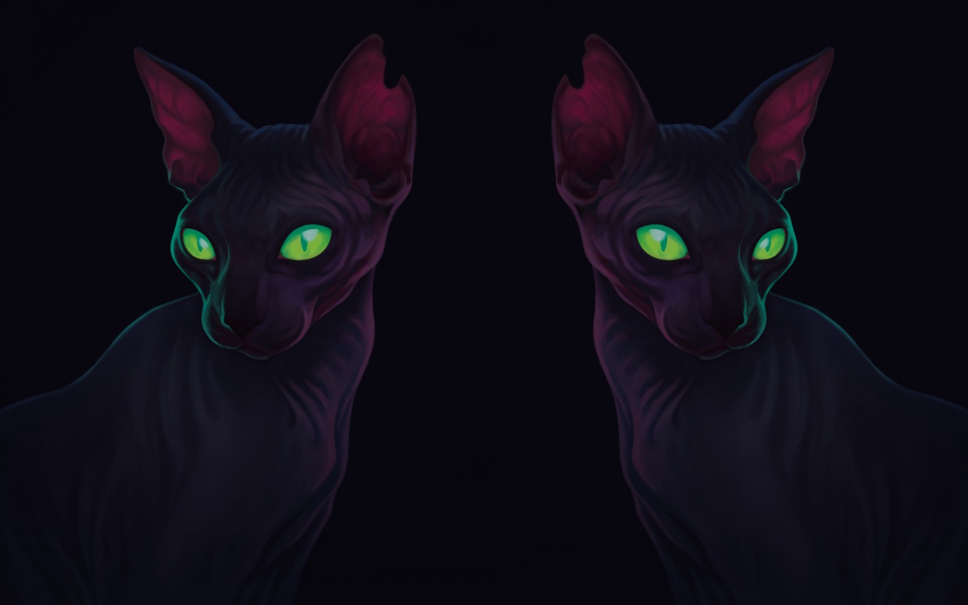 Description: A black cat with green eyes and glowing green eyes in the dark background.