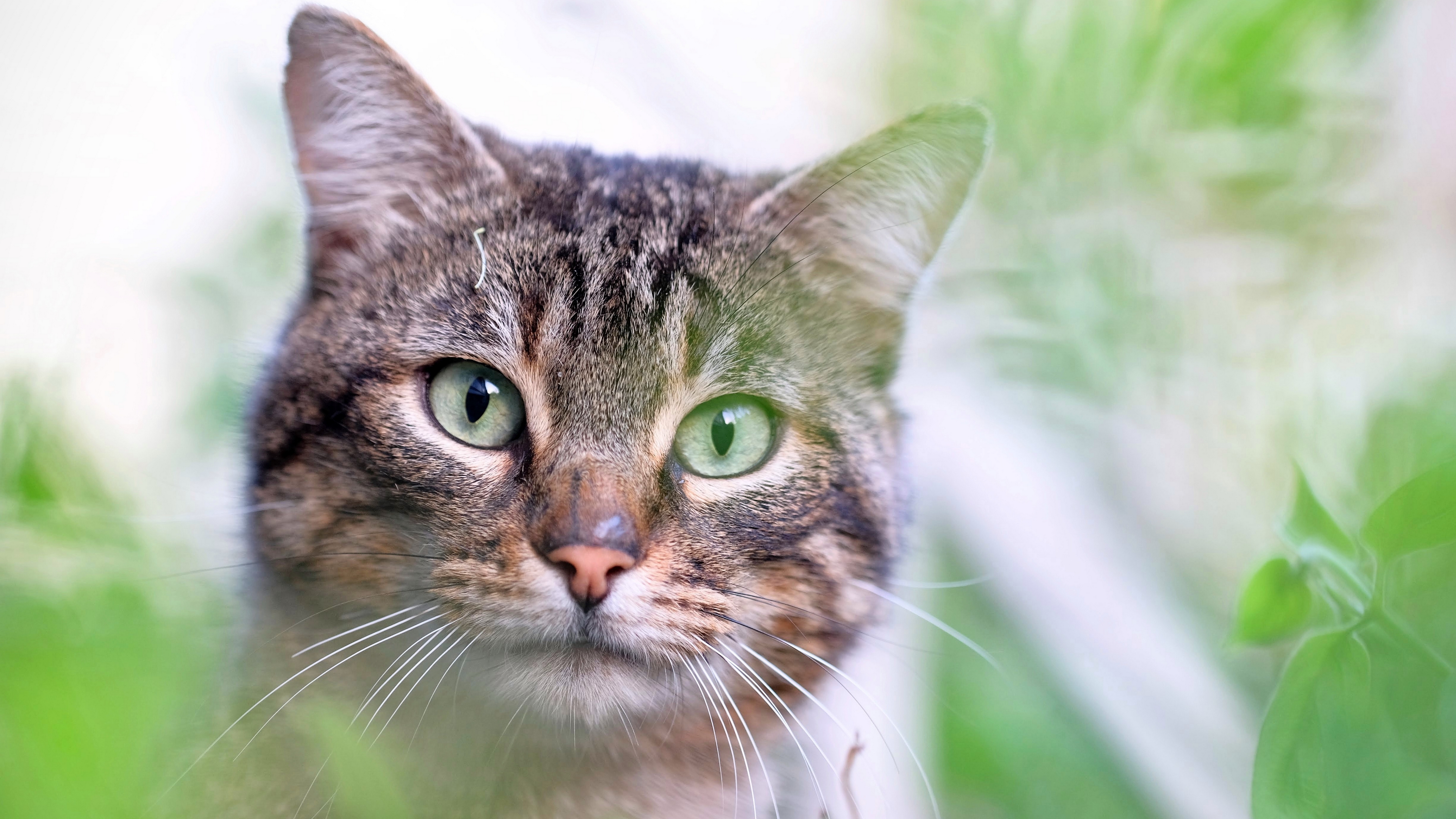 Description: A cat with green eyes looking at the camera with a blurry background of grass and leaves behind it.