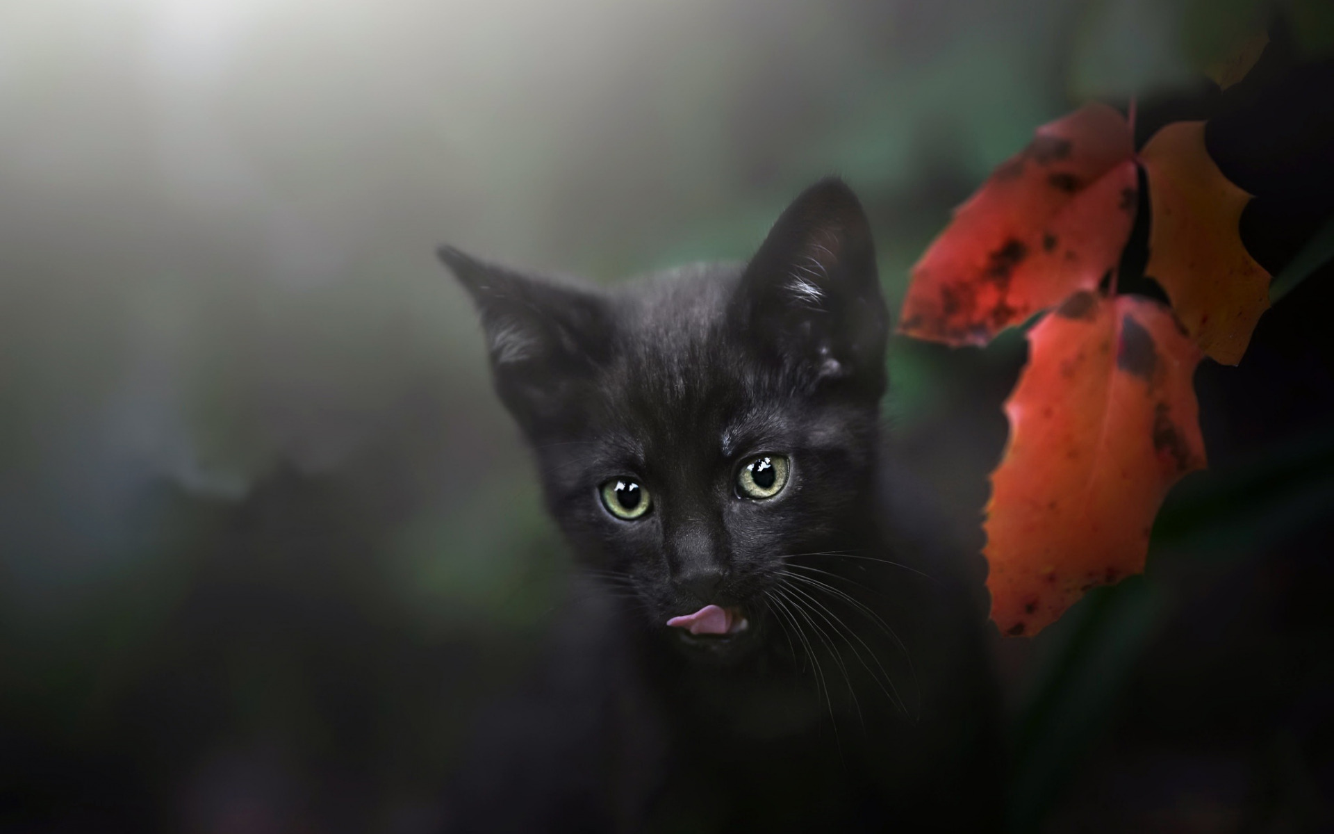 Description: A black cat with green eyes looking at the camera with a red flower in the background and a blurry background.