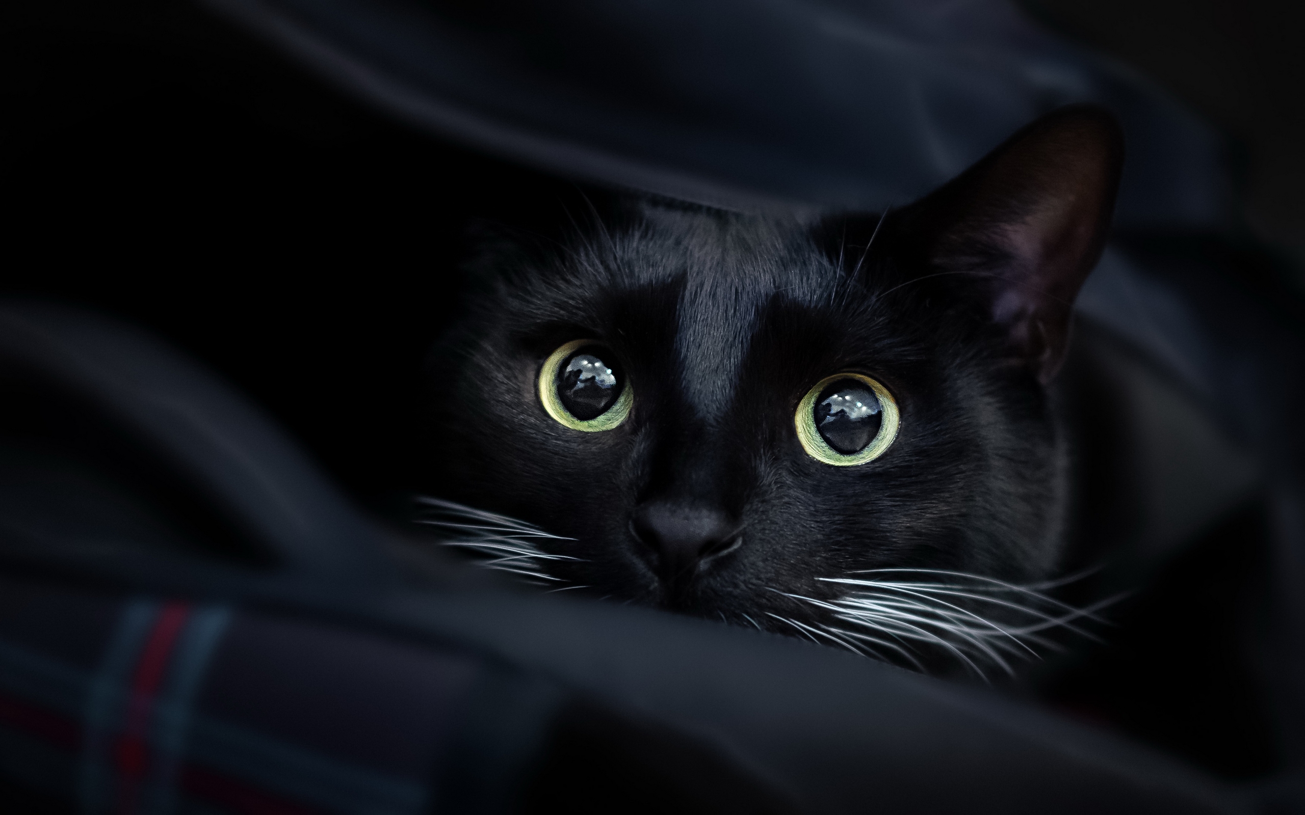 Description: A black cat with green eyes hiding in a blanket with a black background and a black blanket with a black cat with green eyes.