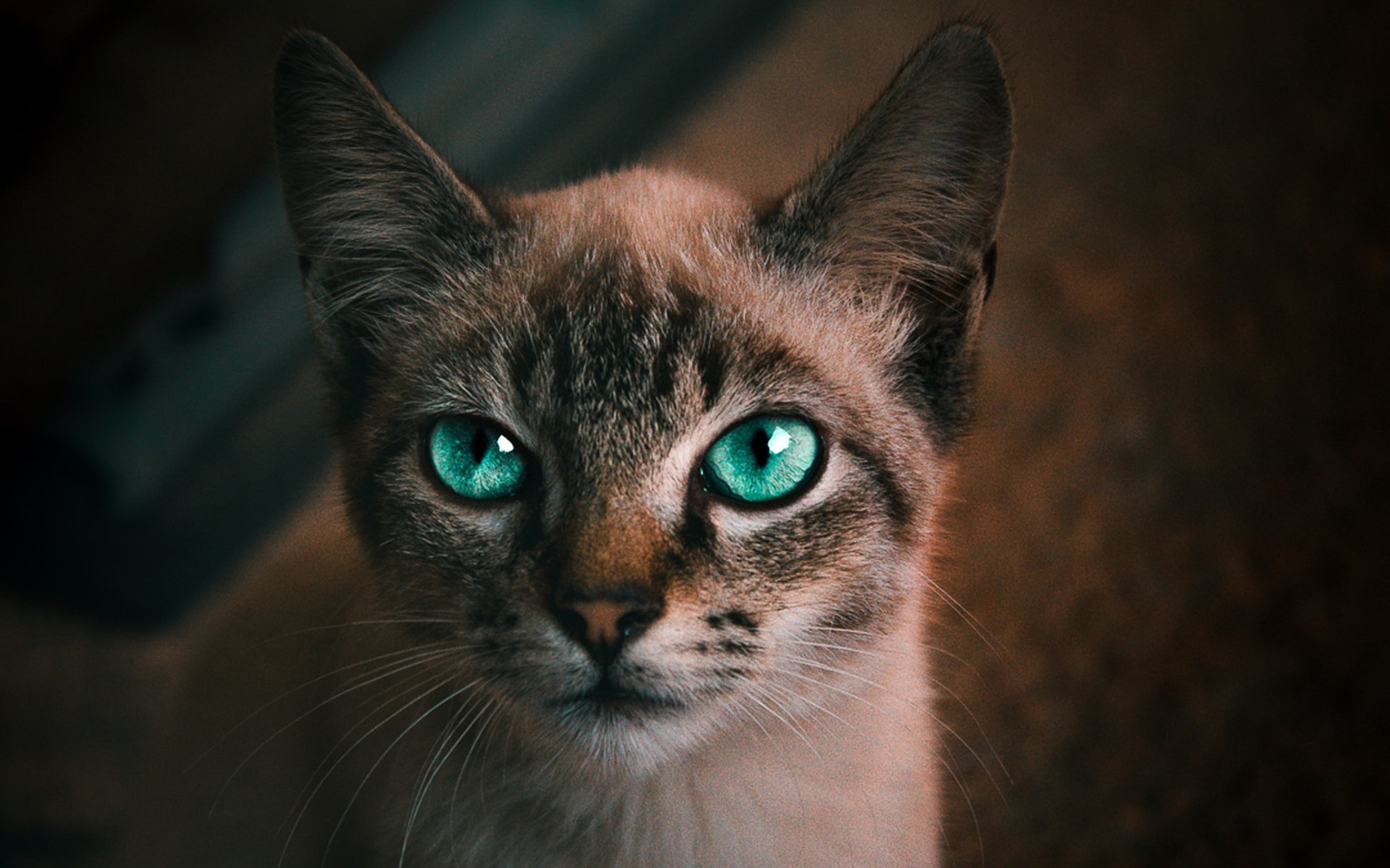 Description: A cat with green eyes looking at the camera with a serious look on its face and chest.