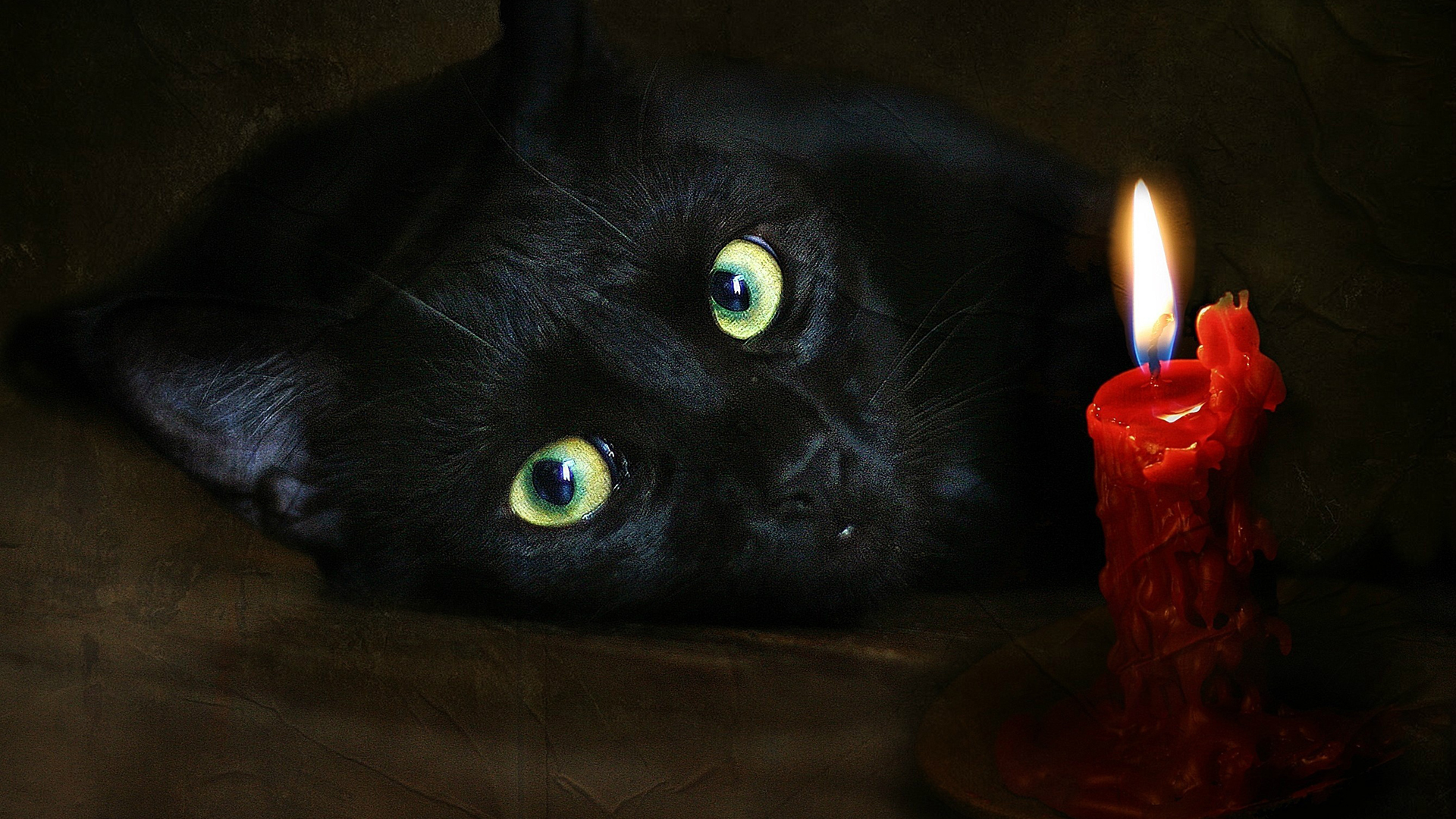 Description: A black cat with green eyes laying next to a red candle with a red flame on it's side.