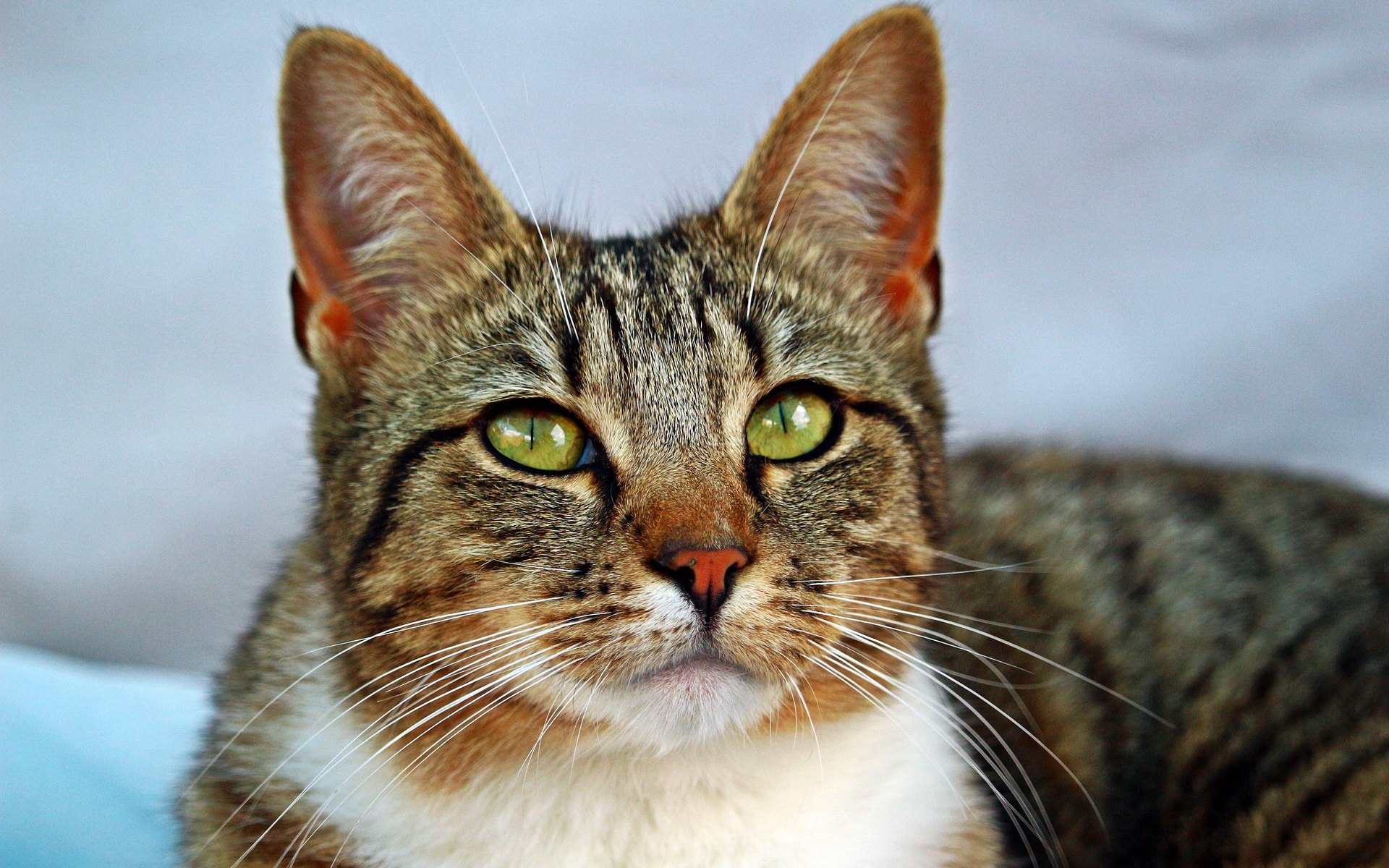 Description: A cat with green eyes sitting on a bed looking at the camera with a sad look on its face.