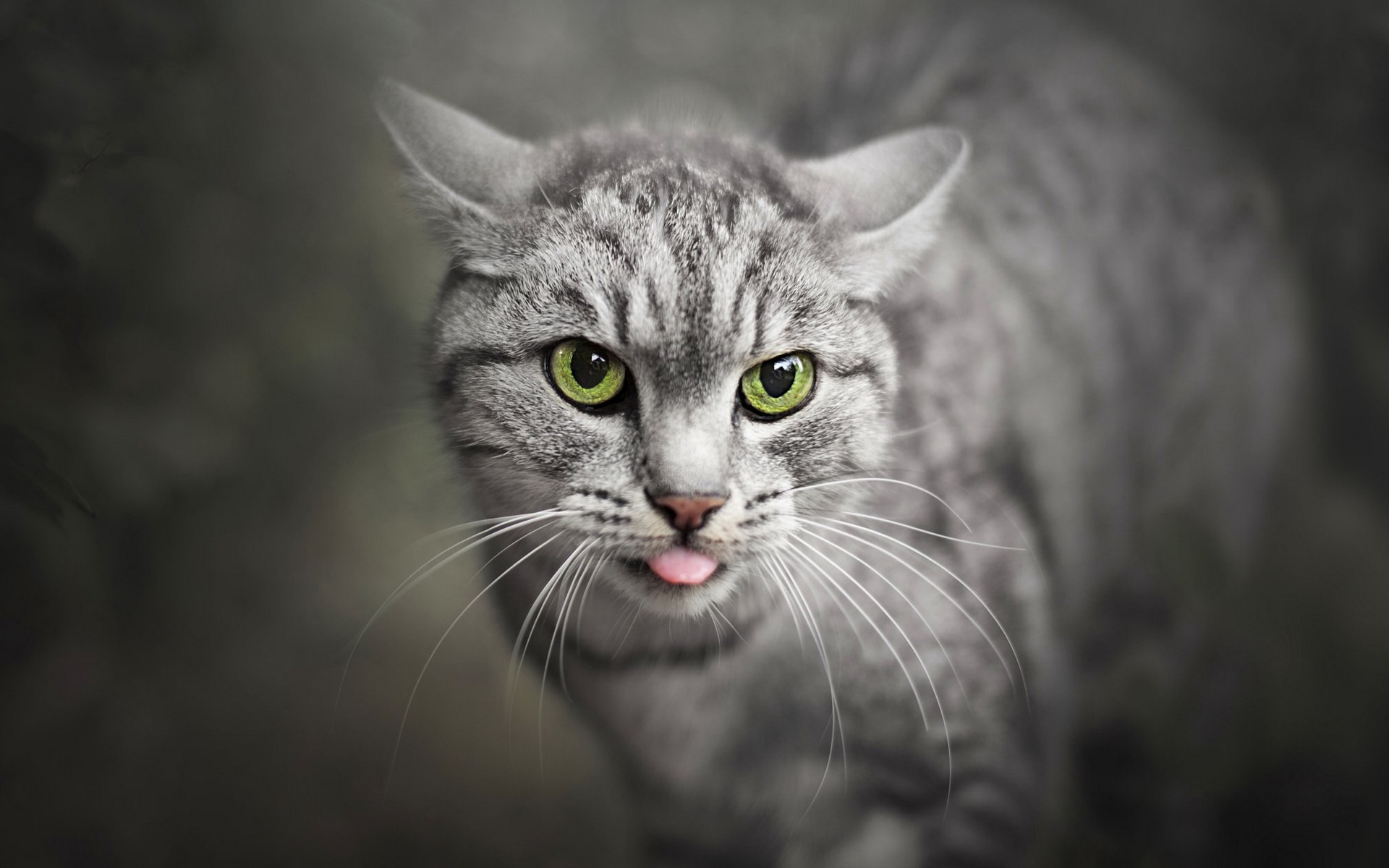 Description: A cat with its tongue out and green eyes looking at the camera with a black background and a white stripe.