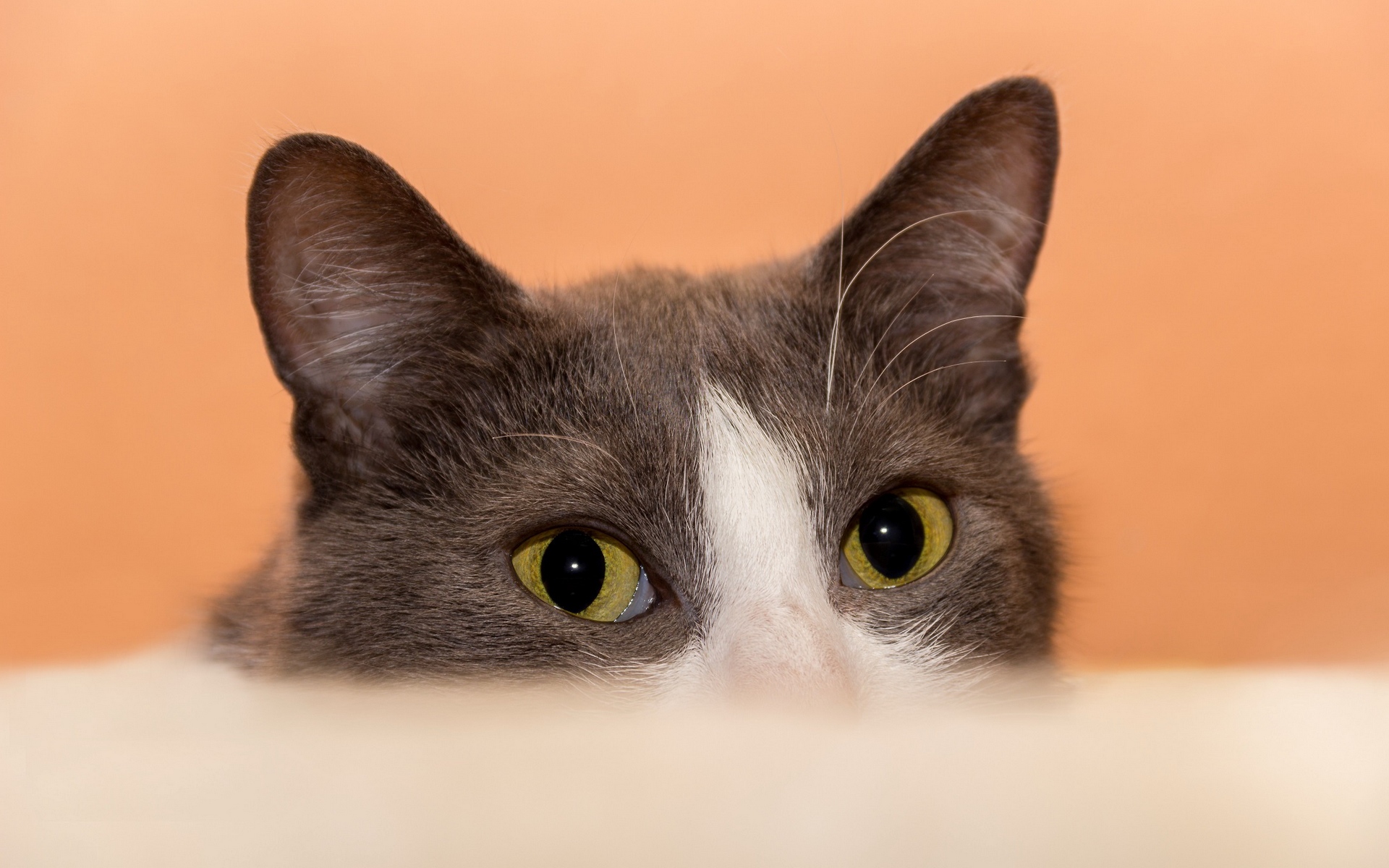 Description: A cat with a white and brown face looking over a white surface with a brown background and a light orange wall.
