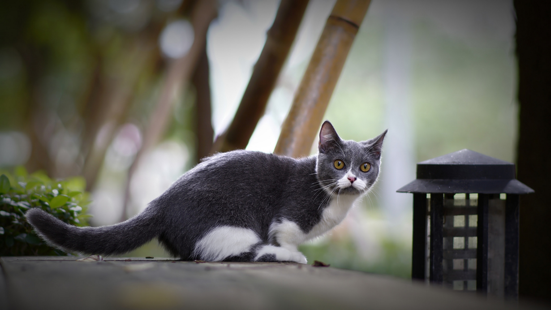 Description: A cat sitting on a ledge next to a lantern and a tree in the background with a blurry background.