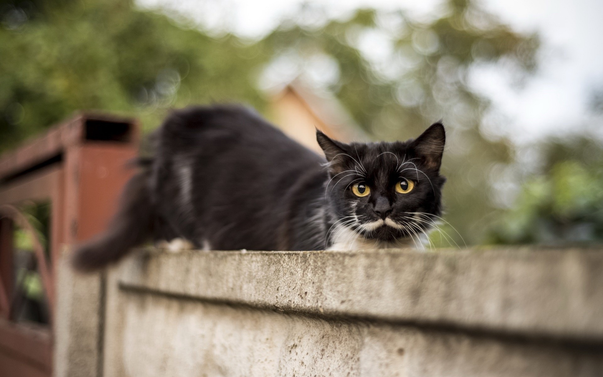 Description: A black cat with a mustache standing on a wall looking at the camera with a serious look on its face.