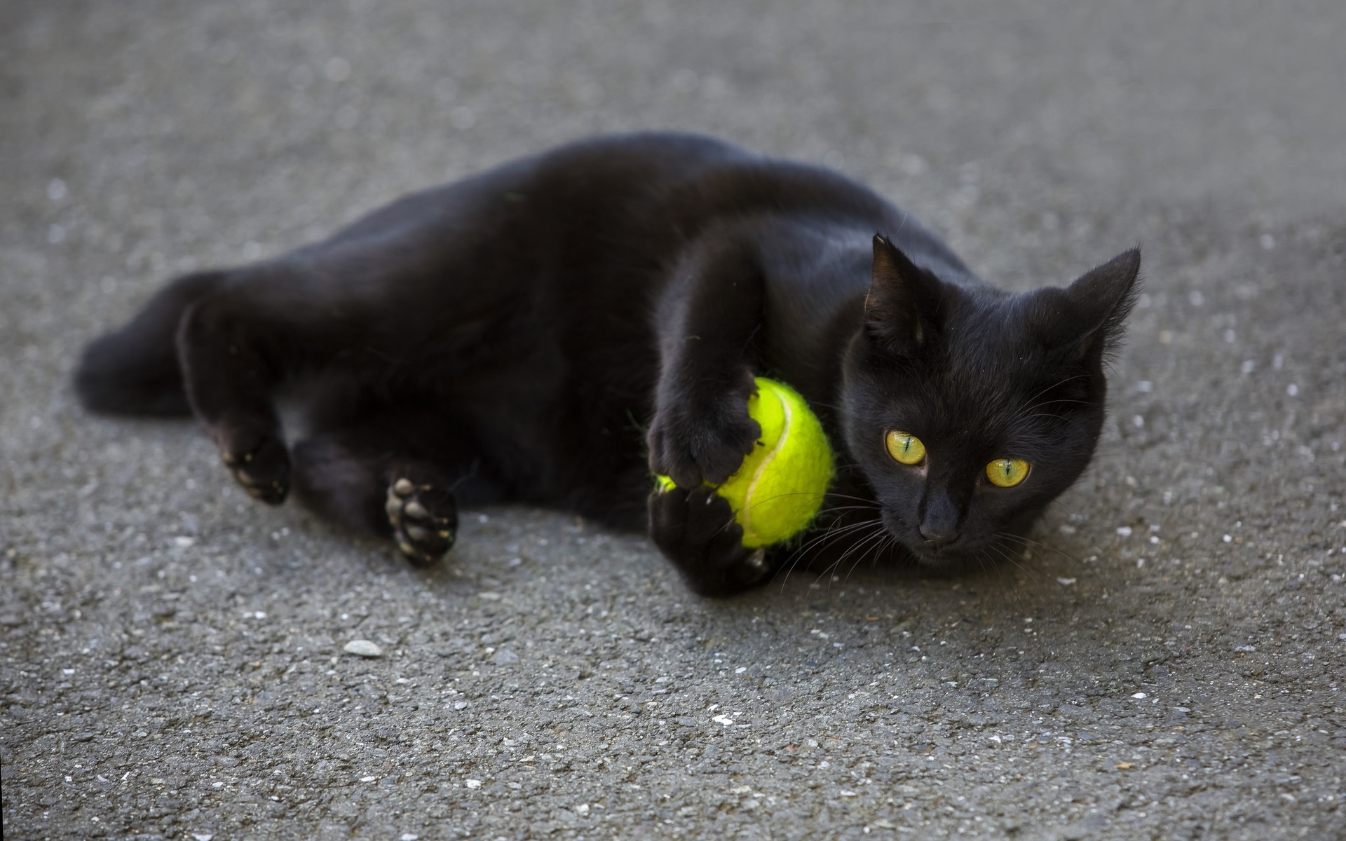 Description: A black cat playing with a yellow ball on the ground with its paws on the ground and its face on the ball.