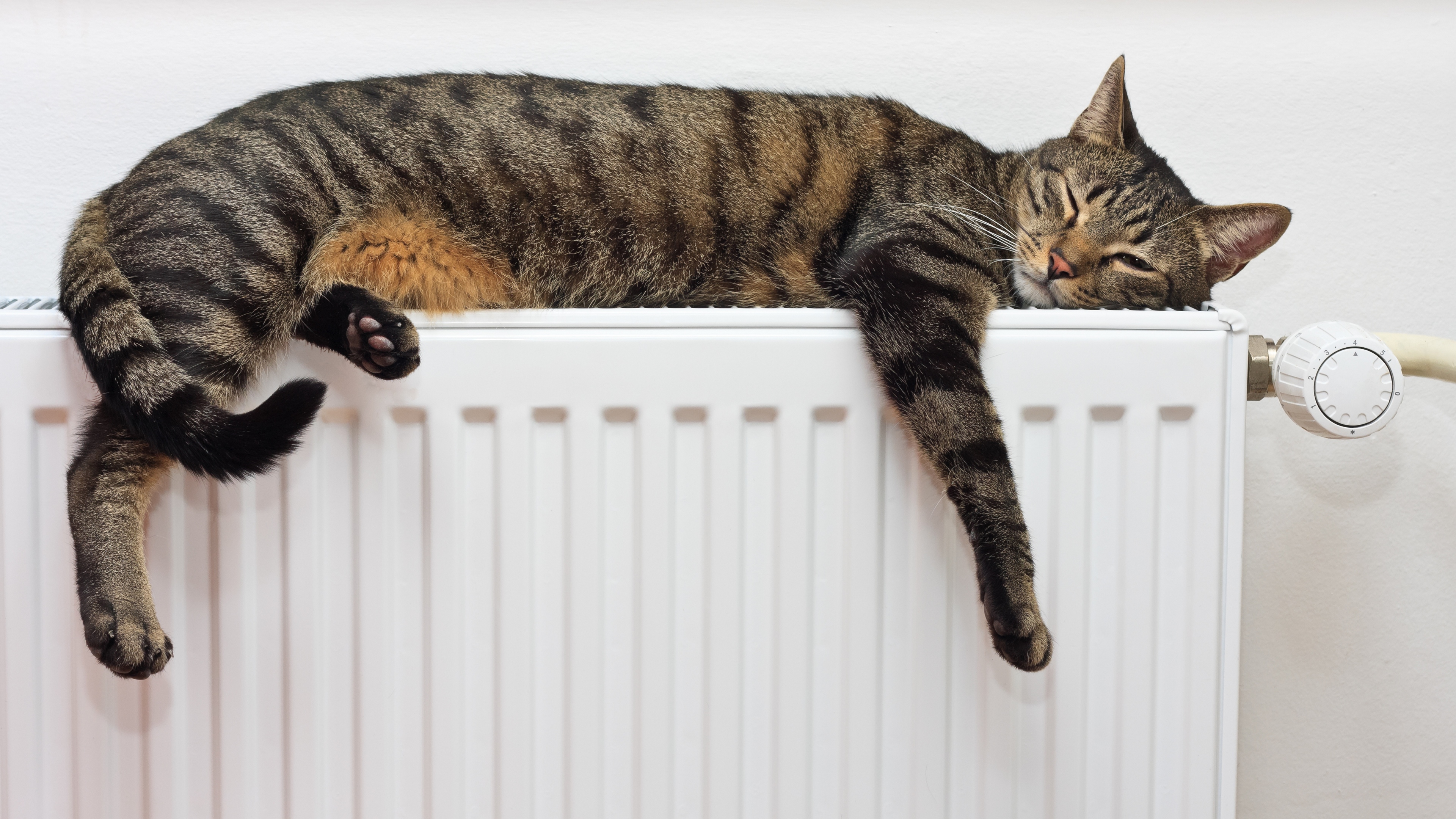 Description: A cat laying on top of a radiator next to a wall mounted heater and a wall mounted heater.