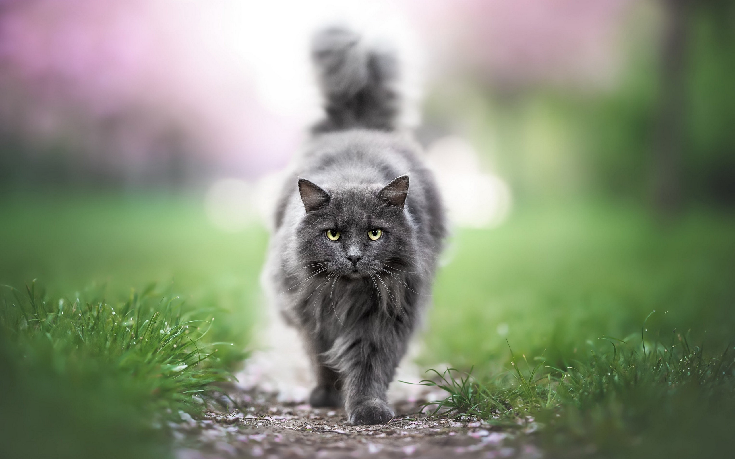 Description: A cat walking down a path in the grass with a blurry background of trees and grass in the background.