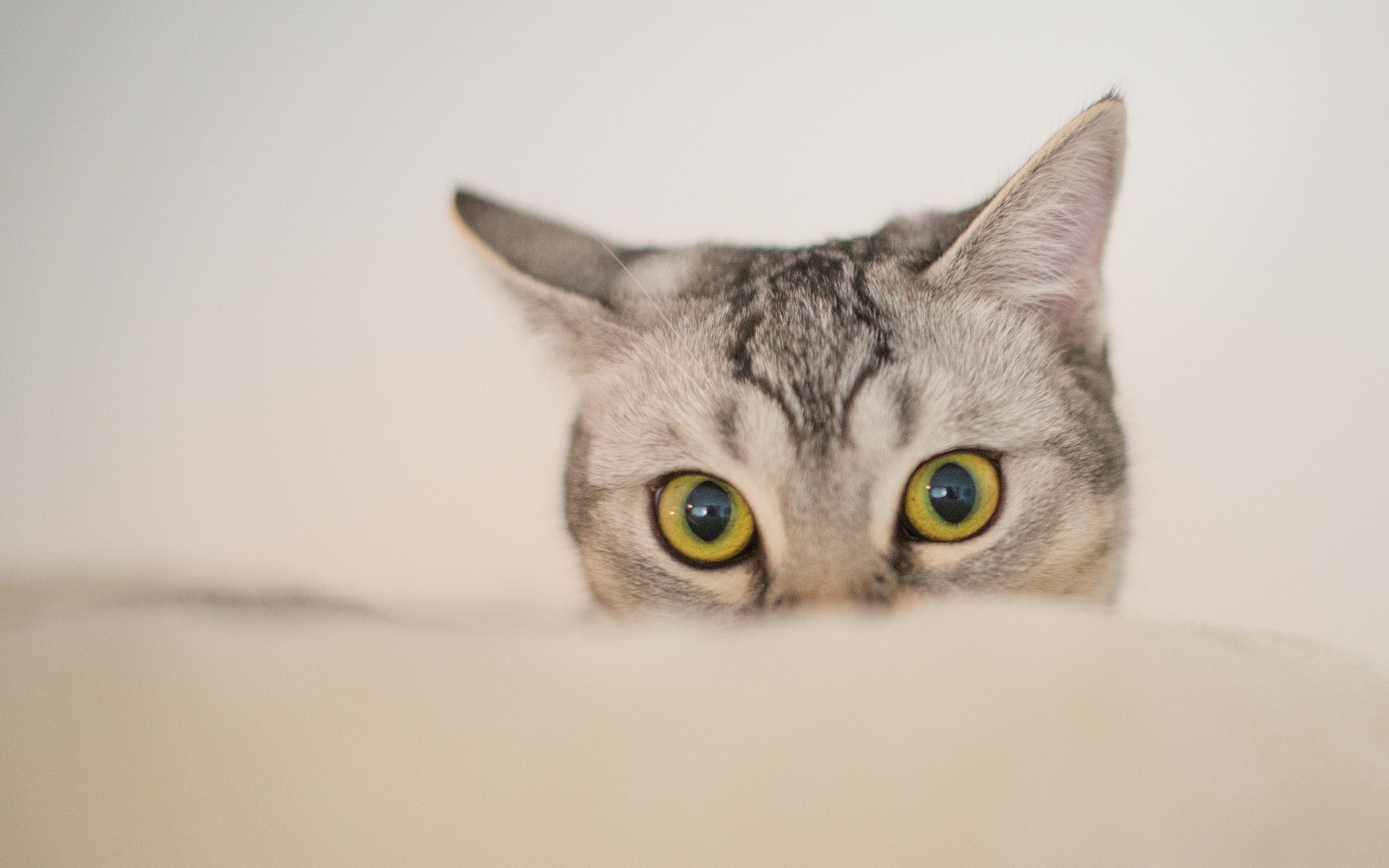 Description: A cat with yellow eyes peeking over a white surface with a white wall behind it and a white wall behind it.