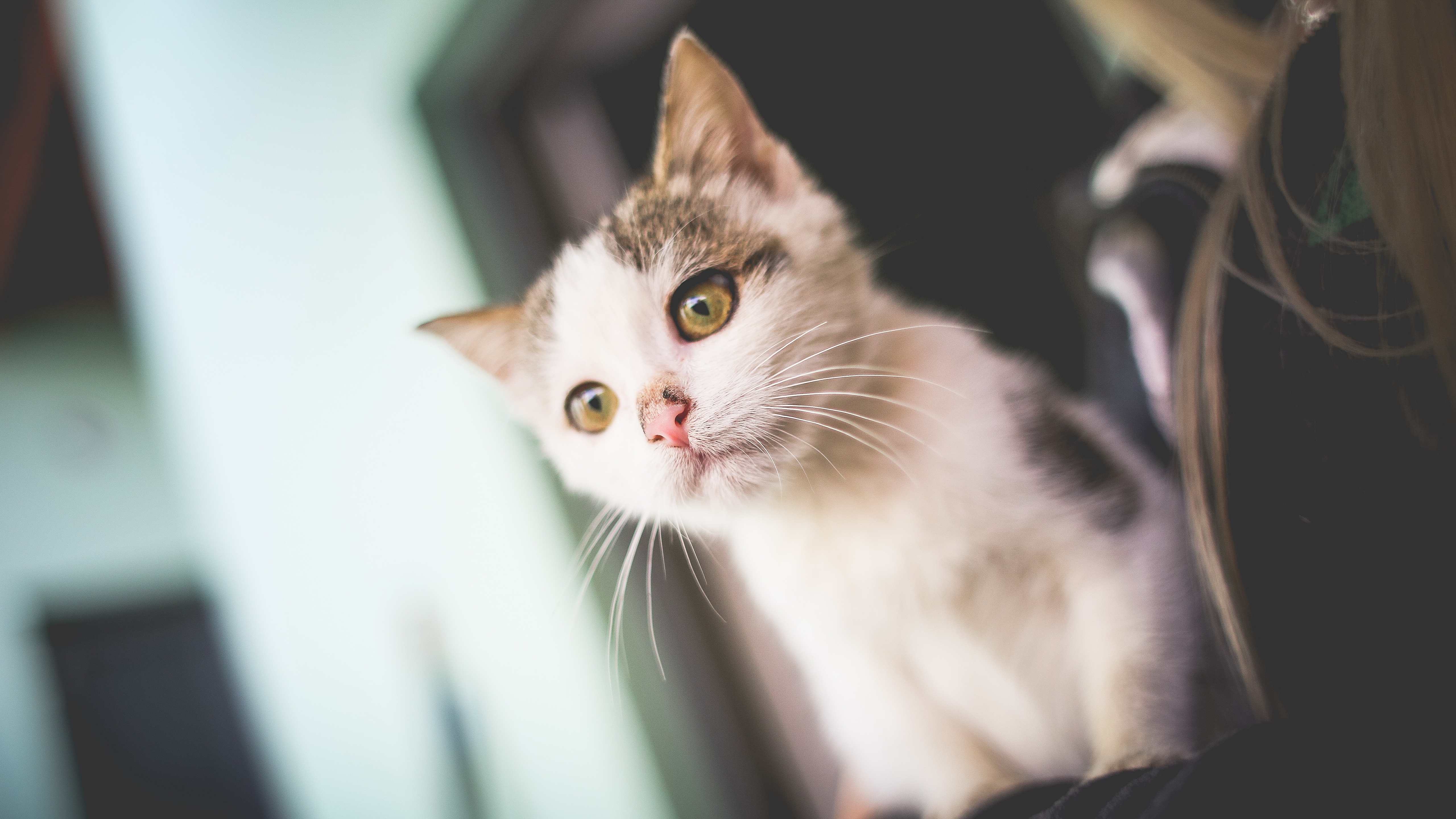 Description: A cat is looking at the camera while sitting on a woman's lap and looking at the camera.
