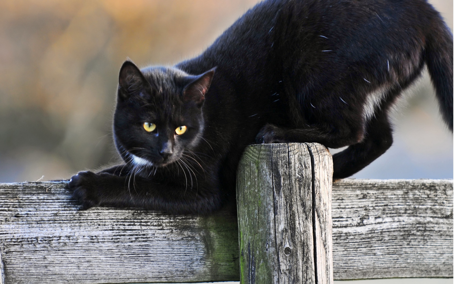 Description: A black cat sitting on a wooden fence looking at the camera with a yellow eye on it's face.