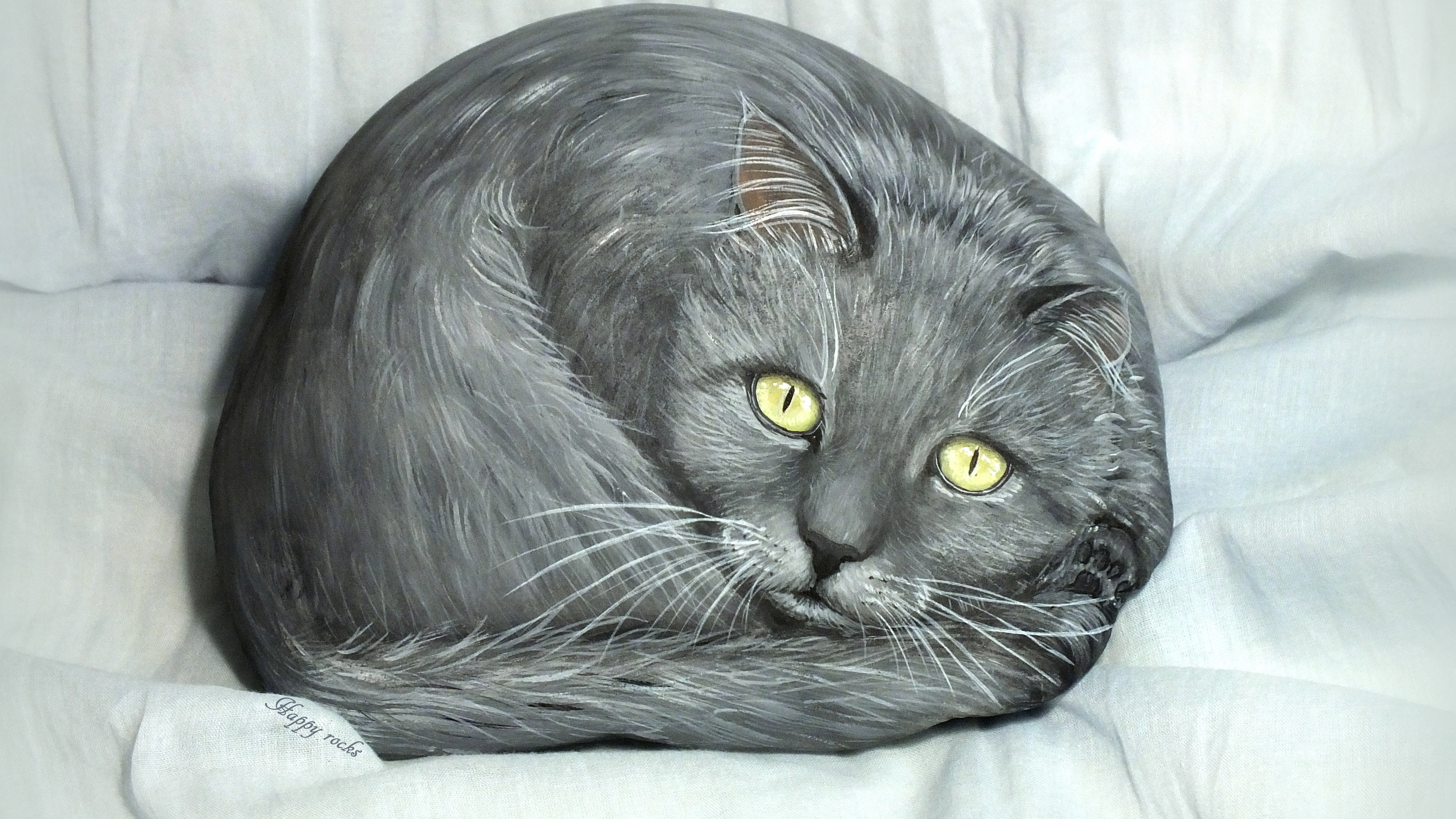 Description: A painting of a cat with yellow eyes laying on a bed sheet with white sheets and a white blanket.