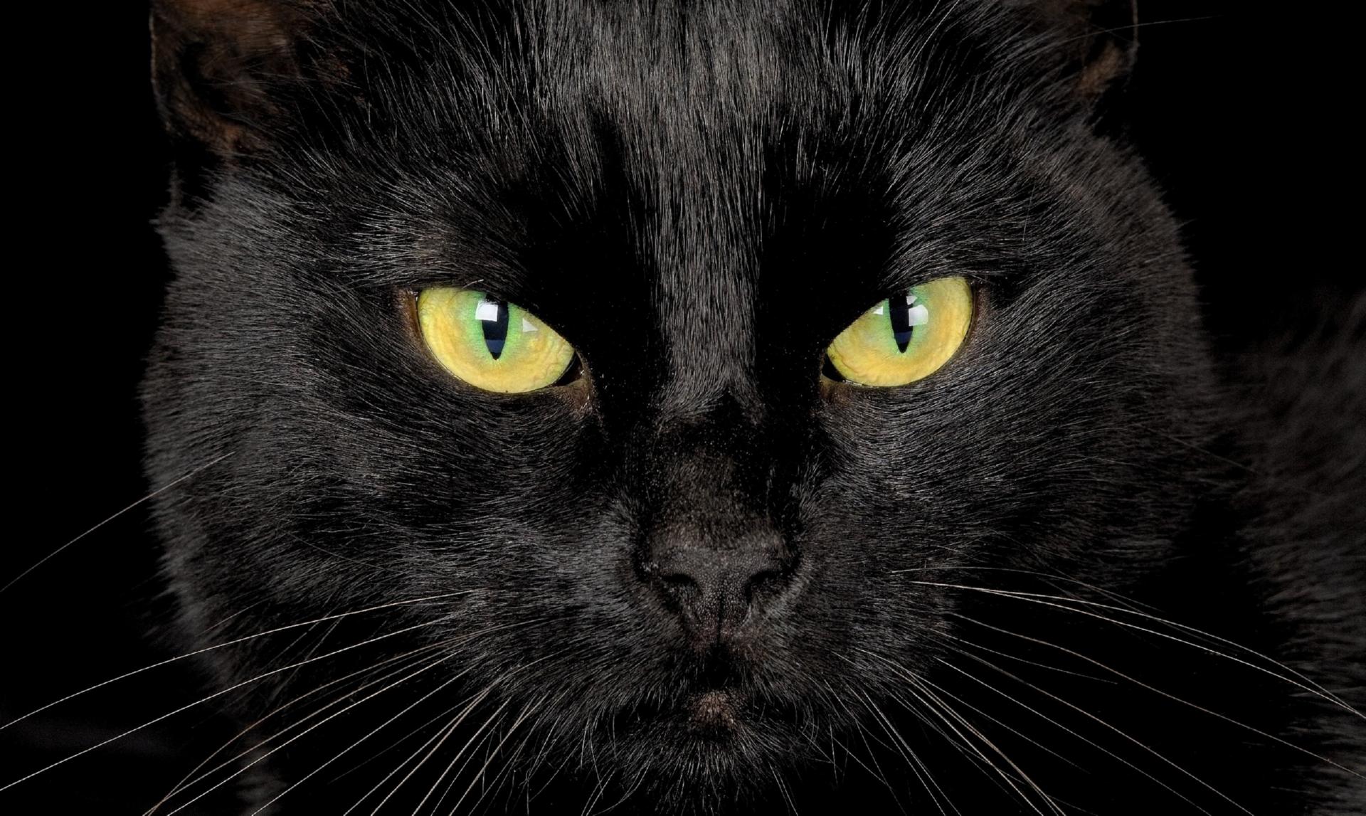 Description: A black cat with yellow eyes looking at the camera with a black background and a black background with a black cat with yellow eyes.