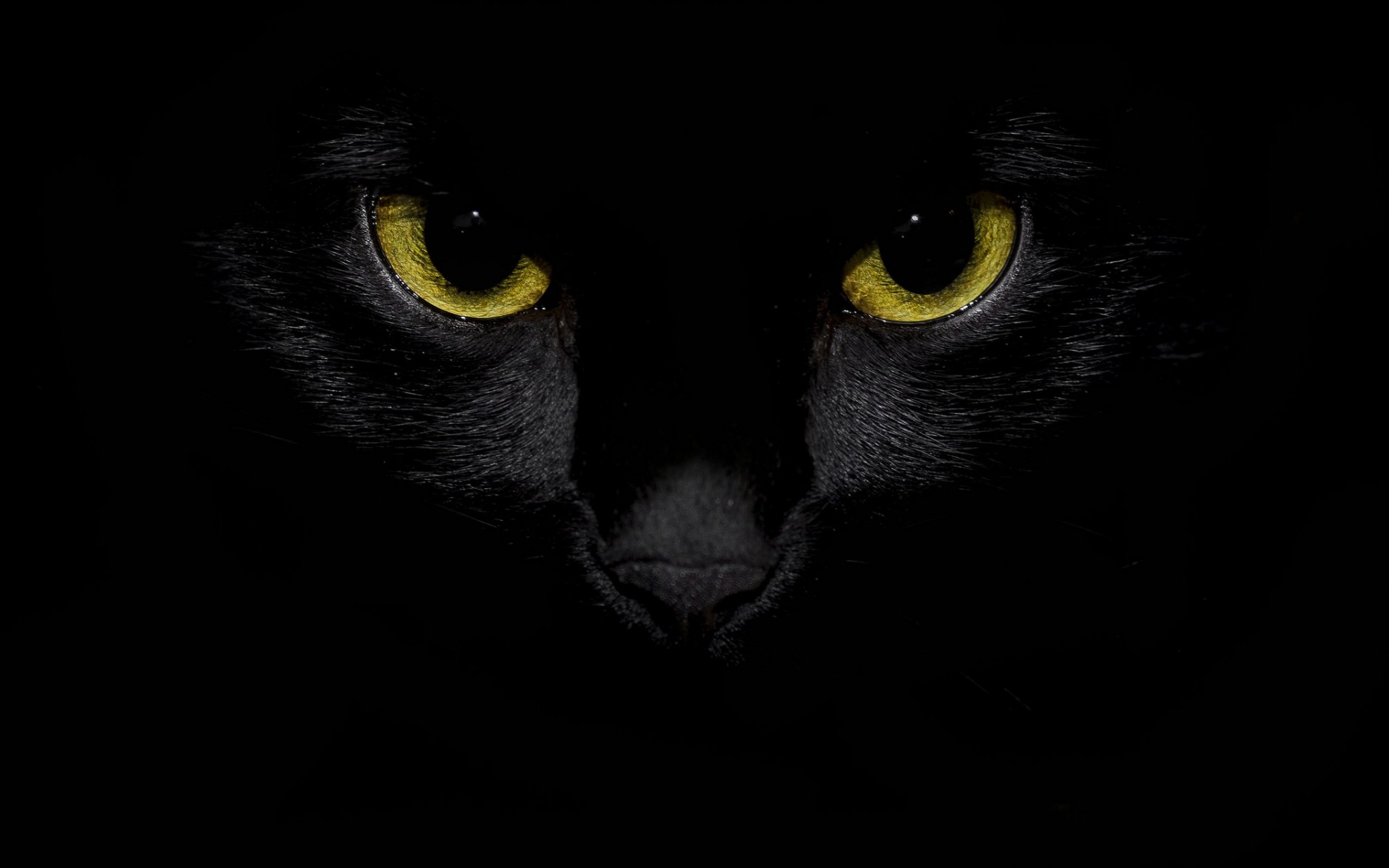 Description: A black cat with yellow eyes in the dark with a black background and a white border around the eyes.