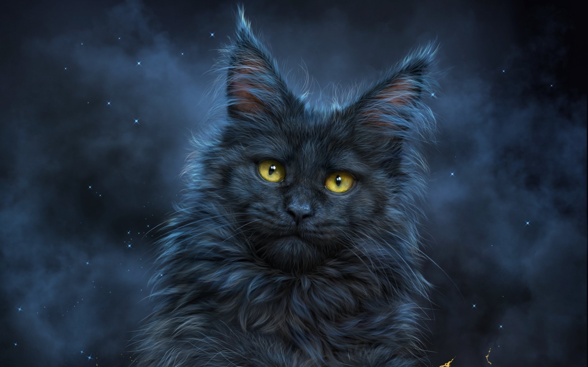 Description: A black cat with yellow eyes sitting in the dark with a dark background and stars in the sky behind it.