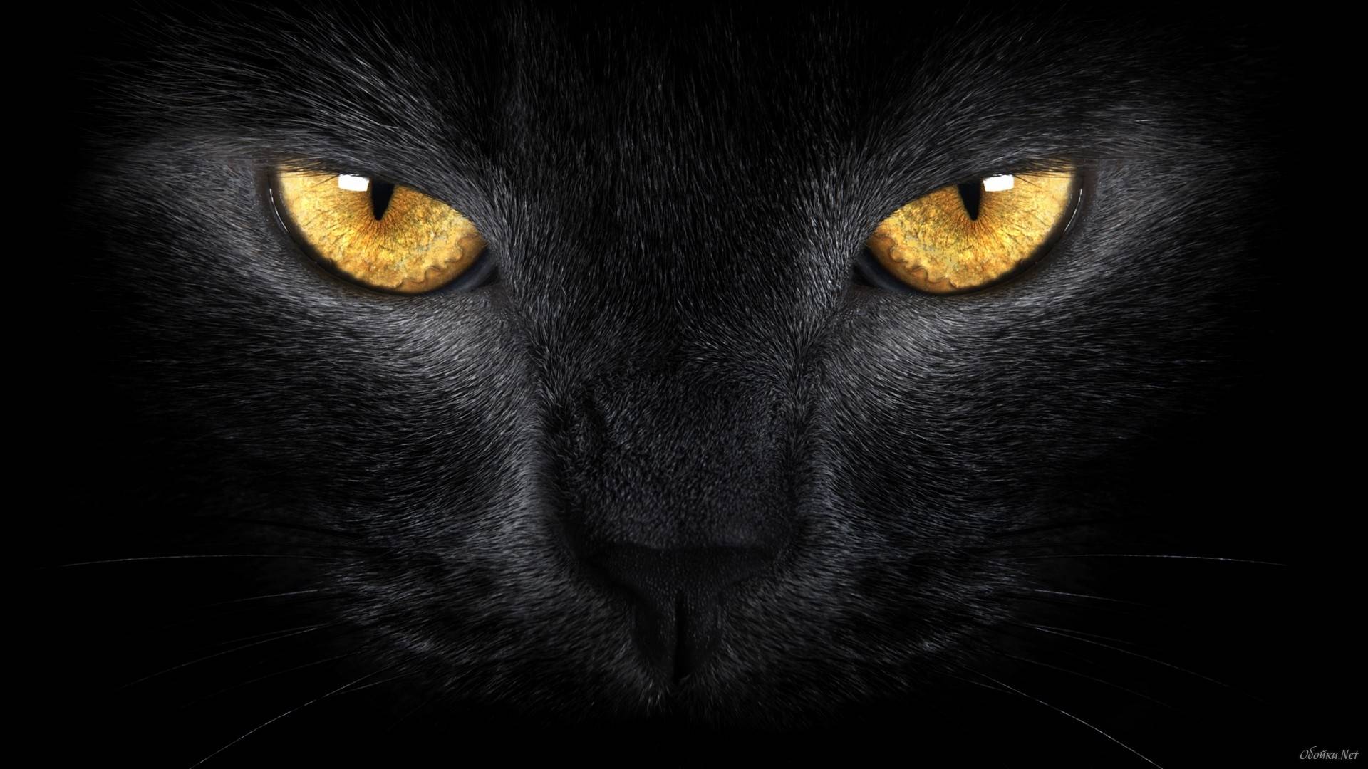 Description: A black cat with yellow eyes looking at the camera with a black background and a black background with a black cat with yellow eyes.
