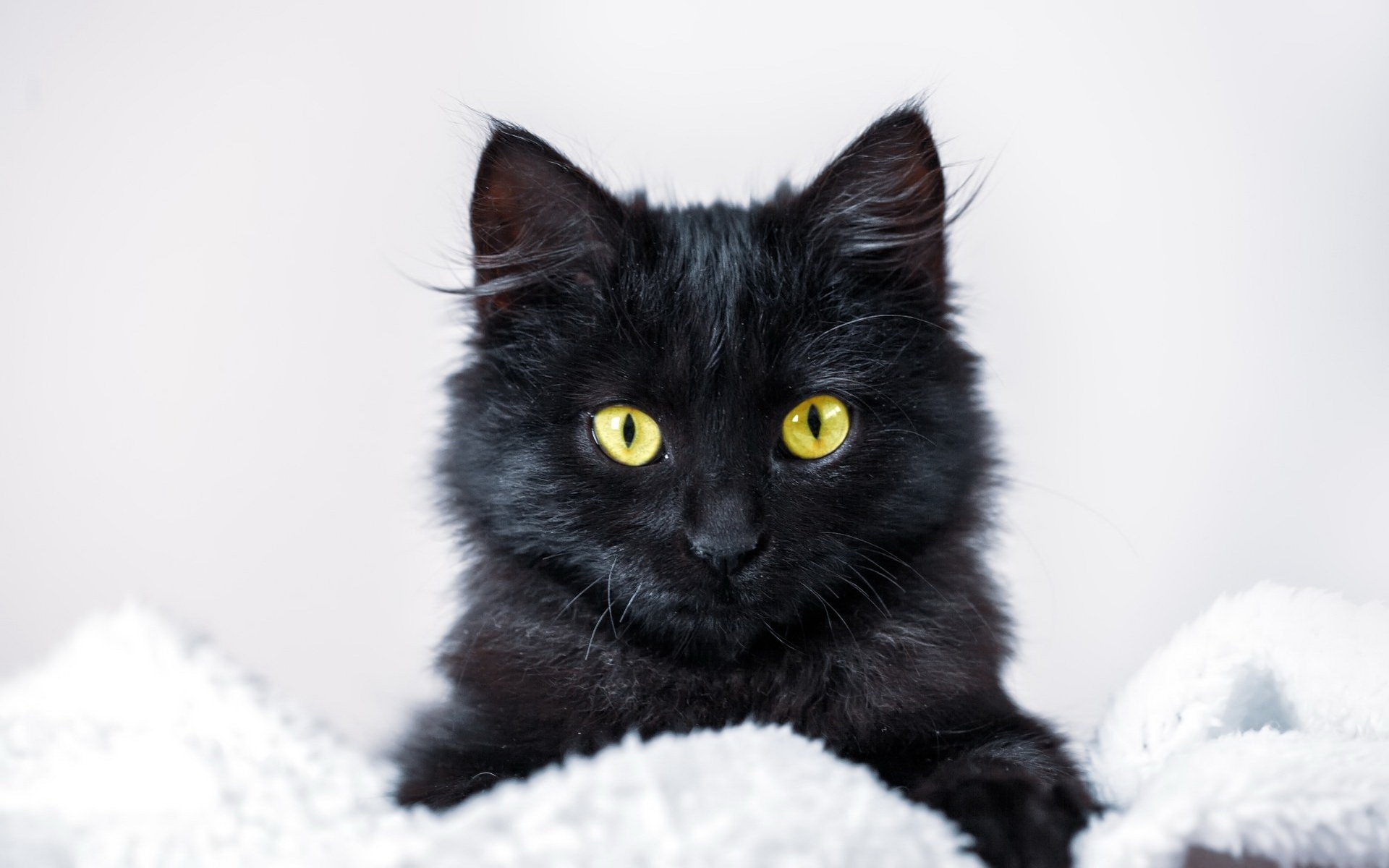 Description: A black cat with yellow eyes laying on a blanket looking at the camera with a sad look on its face.